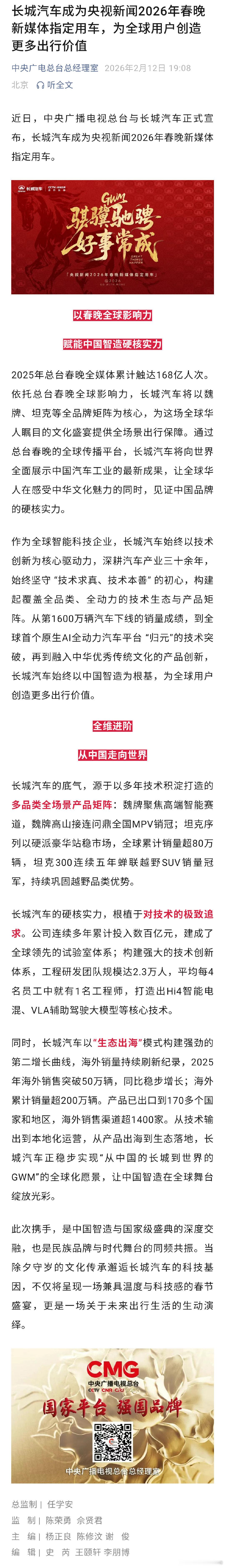 讲真,能连续两年牵手央视春晚的车企,真没几个。长城今年直接把魏牌高山、全新坦克500,送上了央视新闻春晚新媒体指定用车的席位。国家级舞台的严选,千万级全球用户的认可,长城的中国智造,不止靠谱,更是给国产车长脸了。央视严选中国智造春晚严选靠谱车长城汽车探班春晚大v聊车民间艺术观察全新坦克500魏牌高山丙午马年第一天