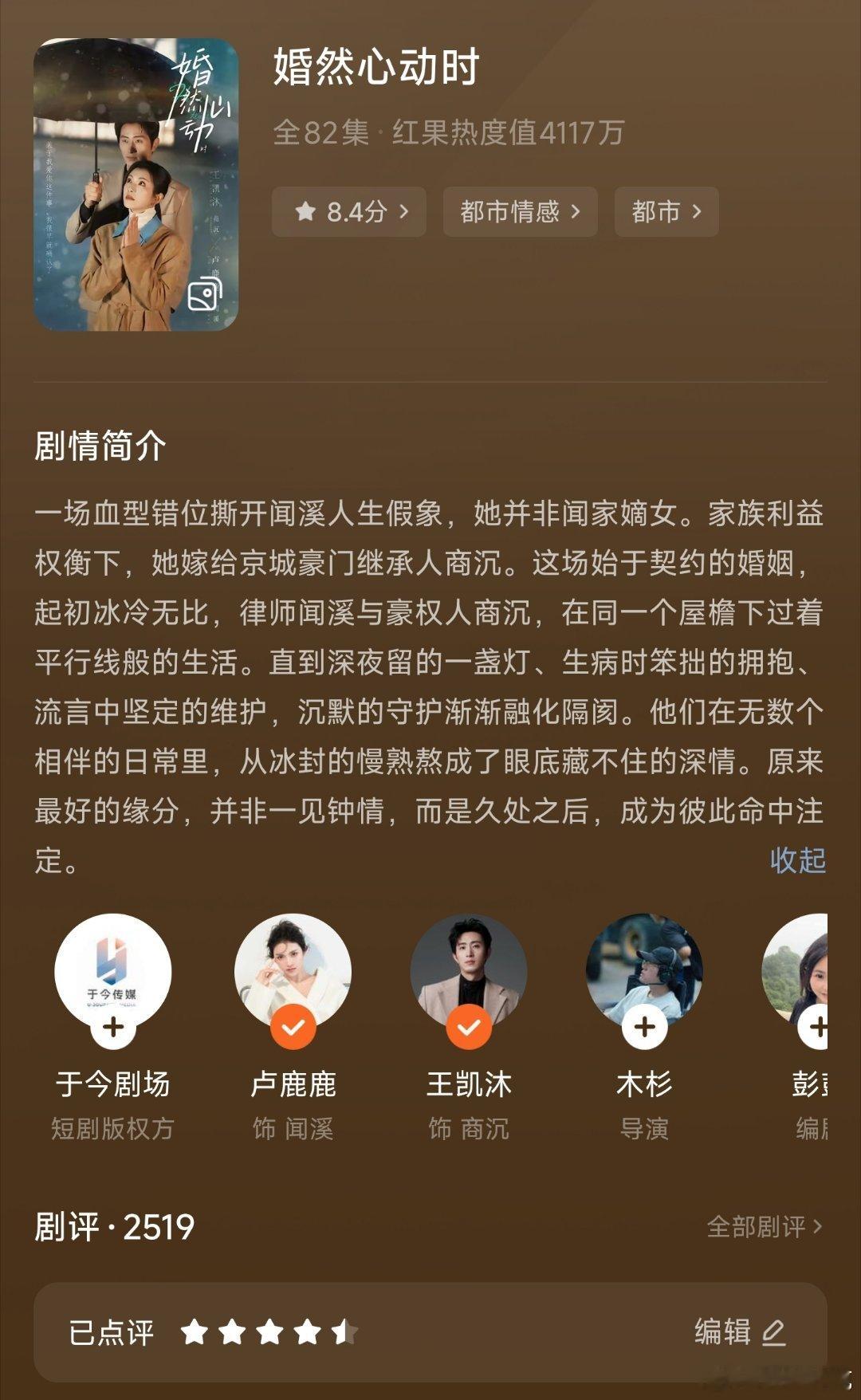这个IP拍了N版,剧本确实挺不错,制作上来之后,观看体验直线上升。这两版原本是最期待的演员版本。王皓祯和徐轸轸的婚后成瘾,看了一点,女主的妆造相当奇怪,演得也不行,完全不贴合人设。弃了。卢鹿鹿和王凯沐的婚然心动时,女主气质形象+演技完成度最高的版本,整体拍得相当不错。就是看导演发文,数据好像撑不起第2季。看不到闻家大哥了