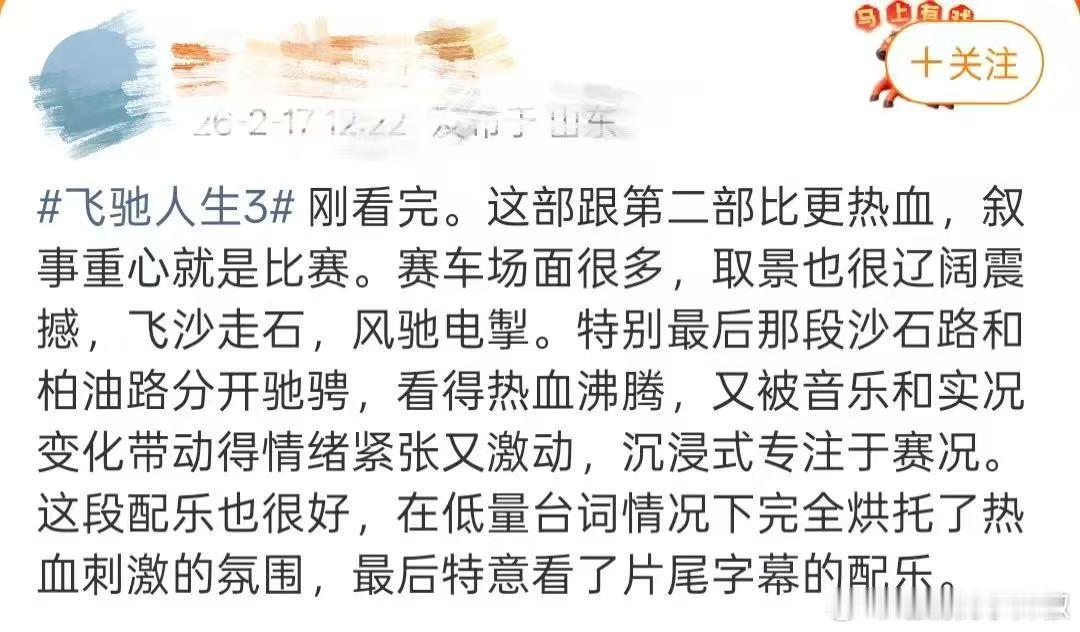 飞驰人生3飞驰人生3好看吗《飞驰人生3》沈腾男团春节档最燃没有之一,真的很燃又被暖到!观影效果很好,后半程全程坐直紧张的不行,像是身临其境参加了一场比赛一样,这部延续了以往飞驰人生的节奏,喜剧元素不是没有,会穿插进剧情里但是不是特别多。个人会觉得2更完整一些,3的话看到电影过半我以为还有一段叙事呢,结果就是一比到底了🏎️飞驰人生的转场一直是没话说的,看的人肾上腺素升高,没想到系列第三部还能玩出新意,韩寒这次把格局打开了,不再只是巴音布鲁克的个人英雄主义,而是将视角投向更复杂的国际赛事与团队协作。前半段幽默风趣,后半段“沐尘100拉力赛”的赛车场面依旧硬核,引擎声浪直击心脏,但在轰鸣之外,更多了一份人到中年的温柔与和解。在春节档能看到这样一部有速度更有温度的电影,值了!毕竟看起来很爽,可以一直聚精会神 飞驰人生3口碑两极分化