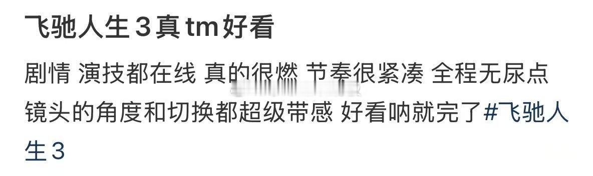 飞驰人生3飞驰人生3好看吗 油门踩到底,热爱不熄不灭。《飞驰人生3》把速度与温情拉满,有爽燃的飙车场面,也有戳心的兄弟情谊,笑着笑着就被感动,春节档必看!