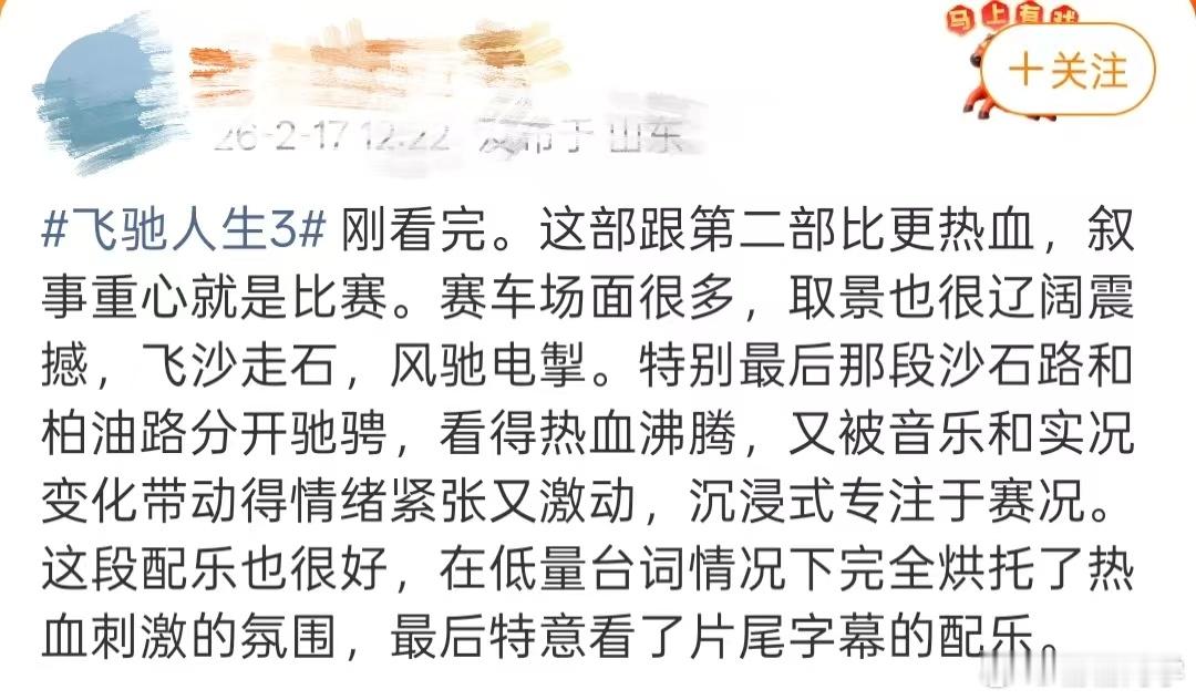 飞驰人生3飞驰人生3好看吗 引擎的轰鸣声由远及近,如同千军万马奔腾而来,瞬间将气氛拉满。赛车手们眼神坚定,紧握方向盘,向着终点全力冲刺。这紧张刺激的场面,让我热血沸腾,爽感直接拉满!