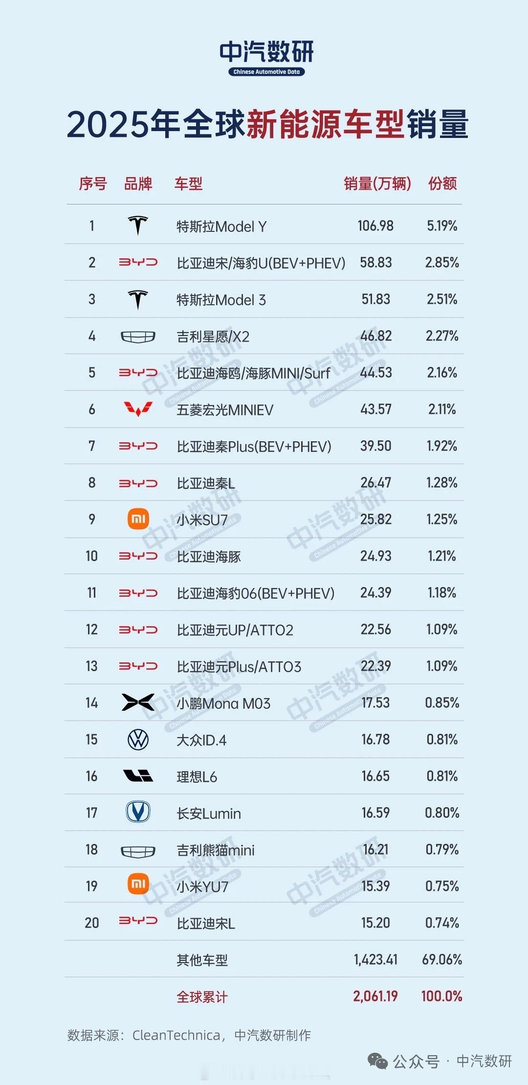 2025年全球新能源品牌与车型top20。