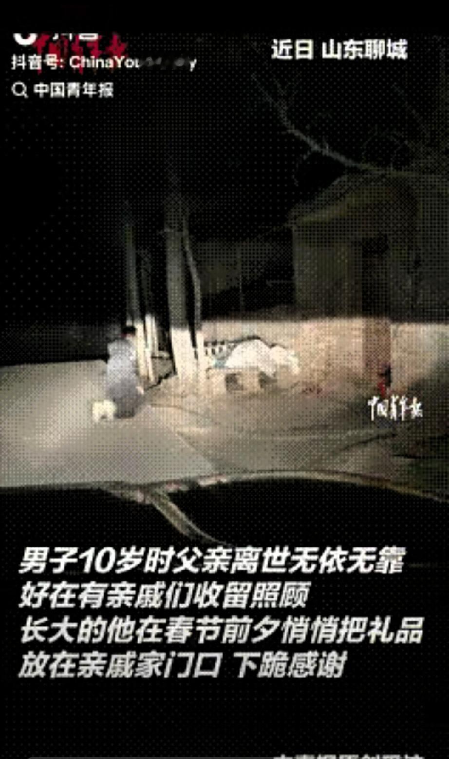 泪目了!山东,一男子春节前本想着给几家亲戚拜年,但又觉得自己一事无成,没脸见他们,他提前准备了礼品和书信,在亲戚家门口郑重行礼磕头,以此表达多年来的感激之情,之后便安静离开。 他幼年时父亲去世,母亲离家,依靠亲戚的照料长大,多年来一直记着亲人给予的帮助。 今年春节,他本想正常上门给亲戚拜年,却因自身创业受挫、经济压力较大,也没有稳定的家庭生活,担心自己的现状让亲人担心,也不愿在白天登门打扰,便选择在夜晚悄悄前往。 这件事看似普通,却体现出最朴素的感恩之心,也让很多人重新思考体面与成功的意义。 当下不少人习惯将成就与物质条件挂钩,认为事业不够顺利、收入不够理想,就缺少面对亲友的底气,甚至回避交往。而这位男子的做法说明,真正值得尊重的从来不是外在的光鲜,而是内心的真诚与良知。 亲戚当年的帮扶,本是出于亲情与善意,并未追求回报,他们更关心的是他的生活与平安。一时的困境不代表人生的失败,守住人品、不忘恩情,才是为人处世最根本的底气。 这件事没有华丽的情节,却充满真实的温度,也让我们看到,平凡人身上的善良与厚道,远比物质更珍贵。这样踏实而重情的人,只要保持初心,生活终究会慢慢变好。