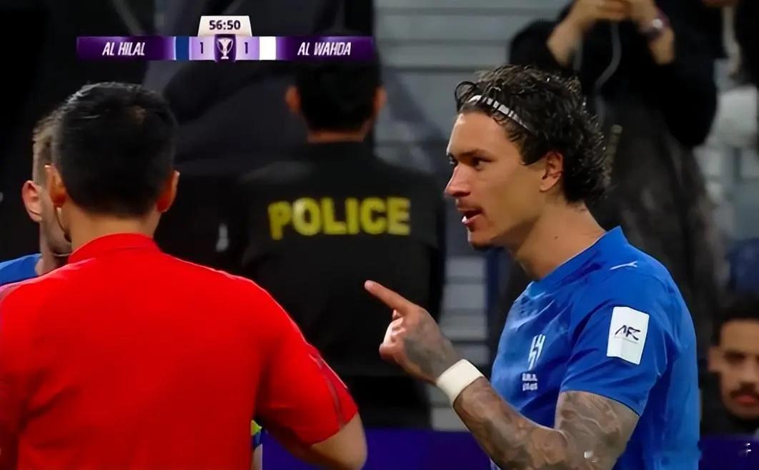 第57分钟,两队球员在阿布扎比统一的后场底线处争夺球权。随后,皮球出了底线,马宁将球权判给了阿布扎比统一。对于这个判罚,努涅斯非常不满。他向马宁鼓掌,并不断说着什么,进行抱怨。