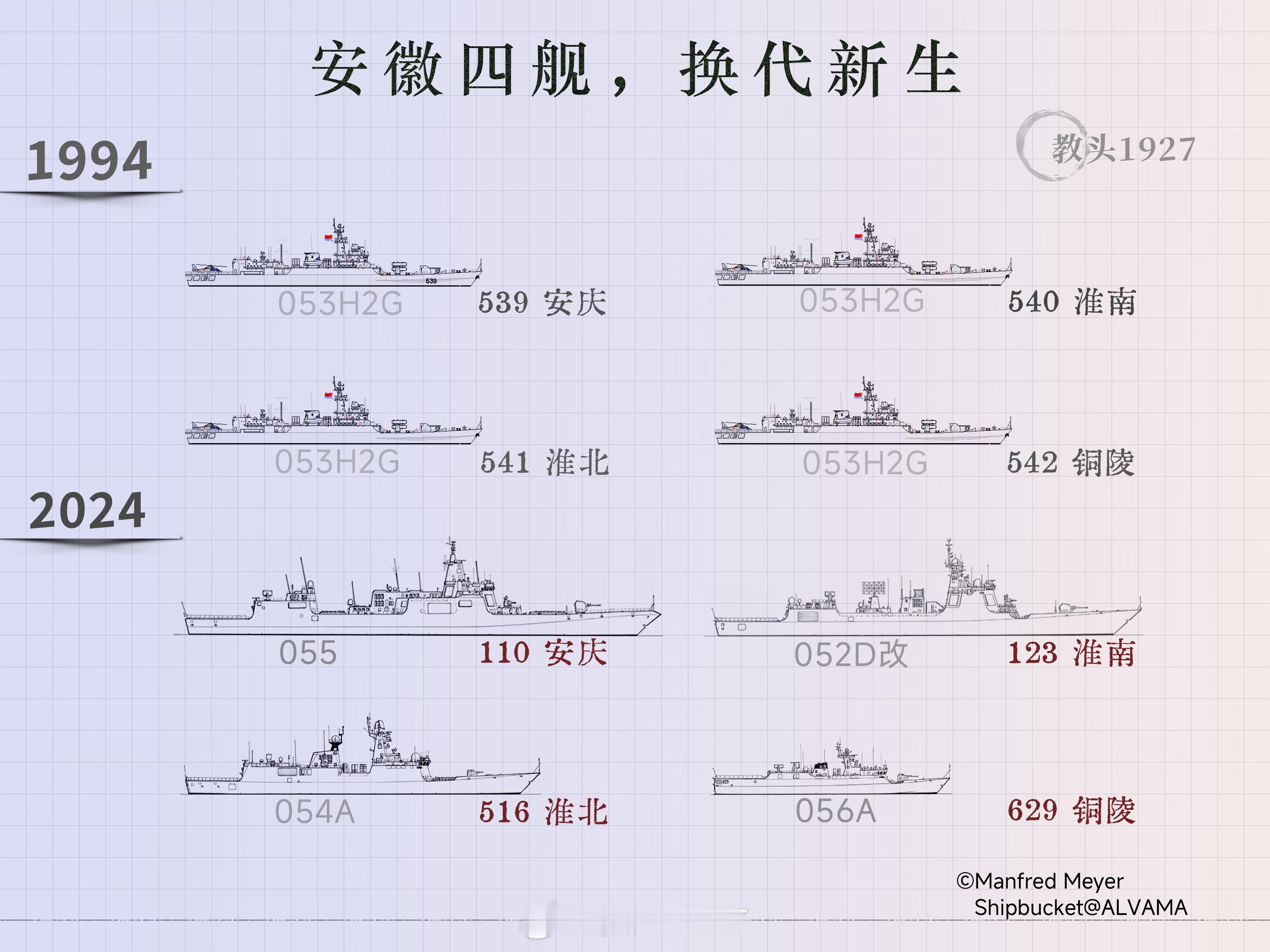 ⚓90年代入列的4艘053H2G均以安徽地级市命名,如今4市均已重新命名新一代驱护舰,正好囊括四大主力型号,令人感慨