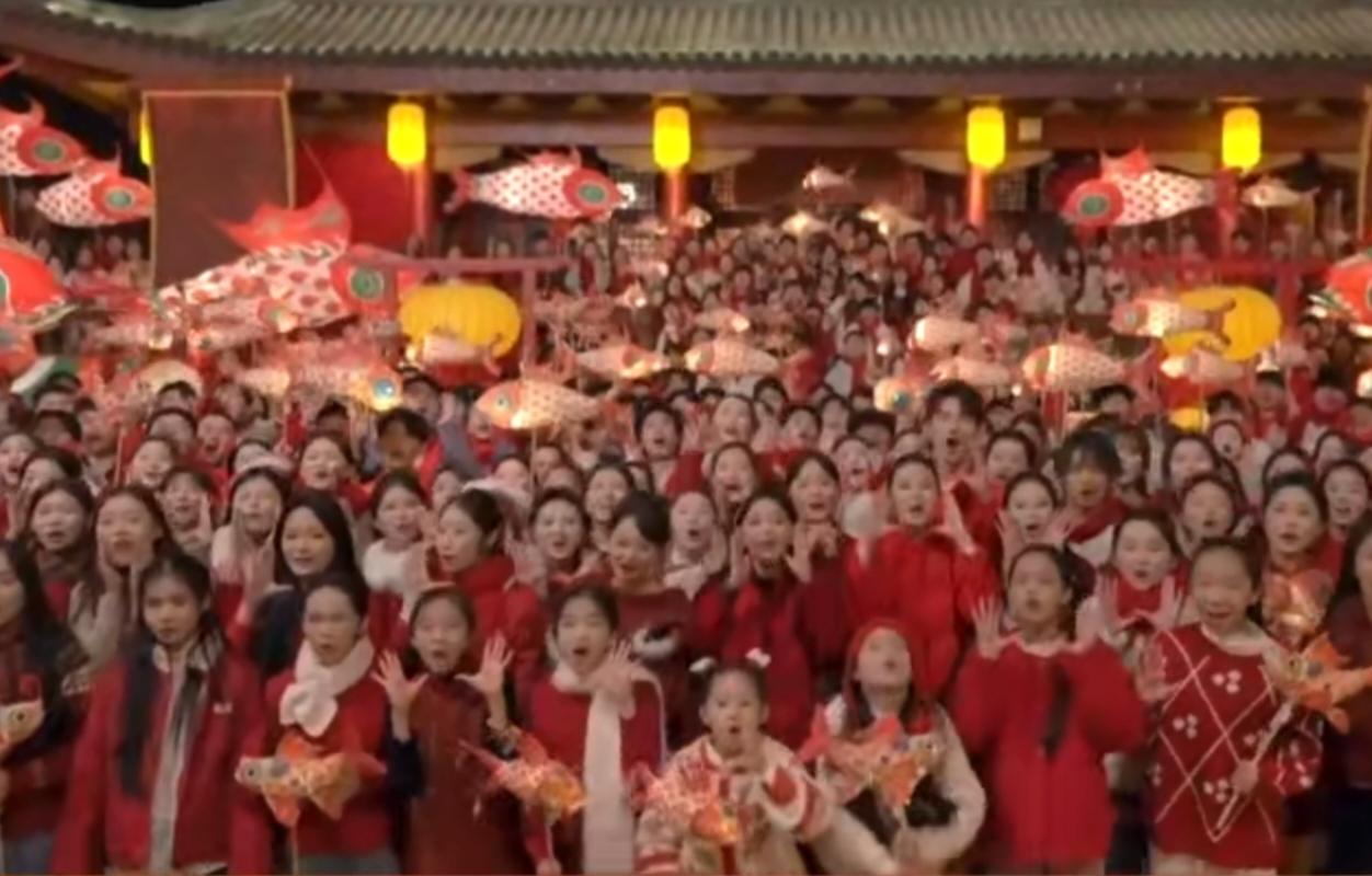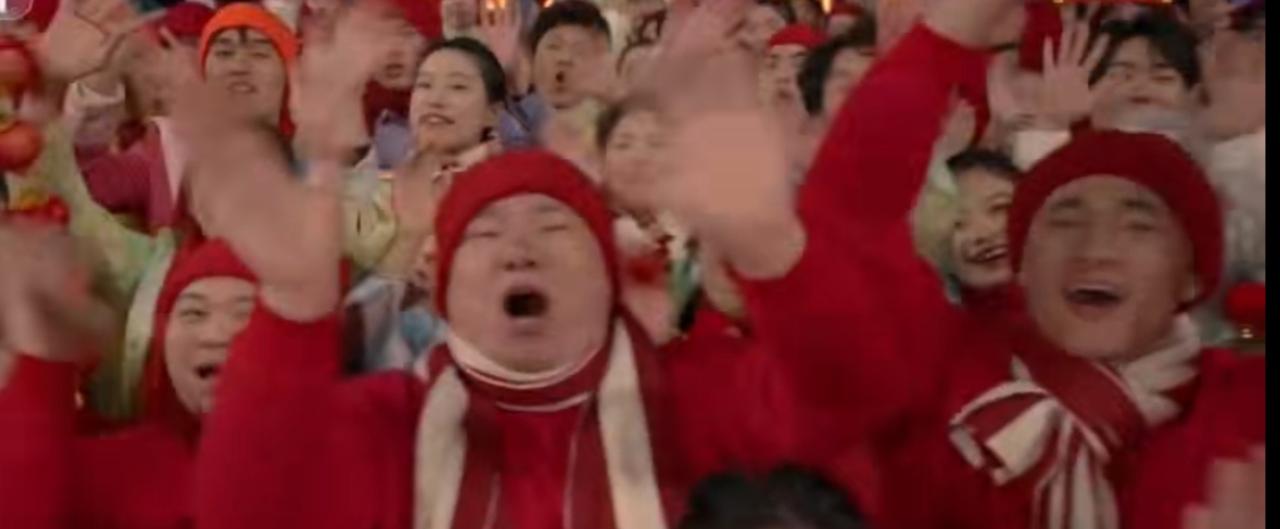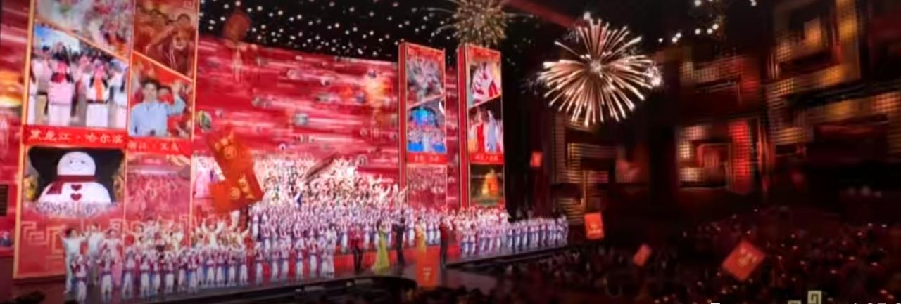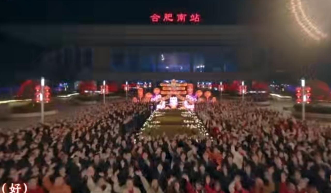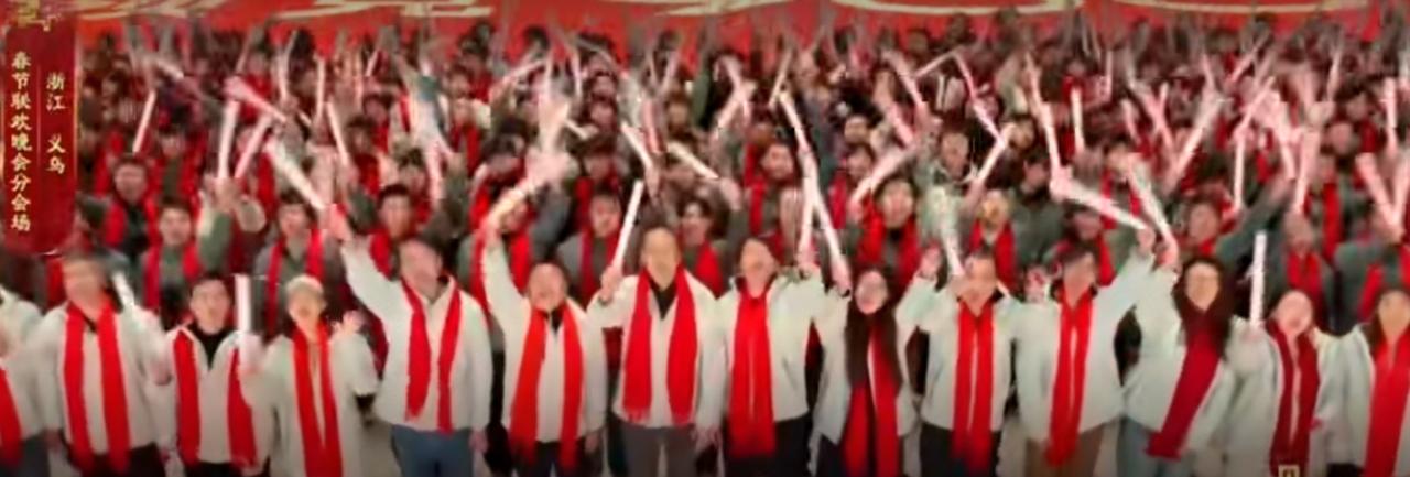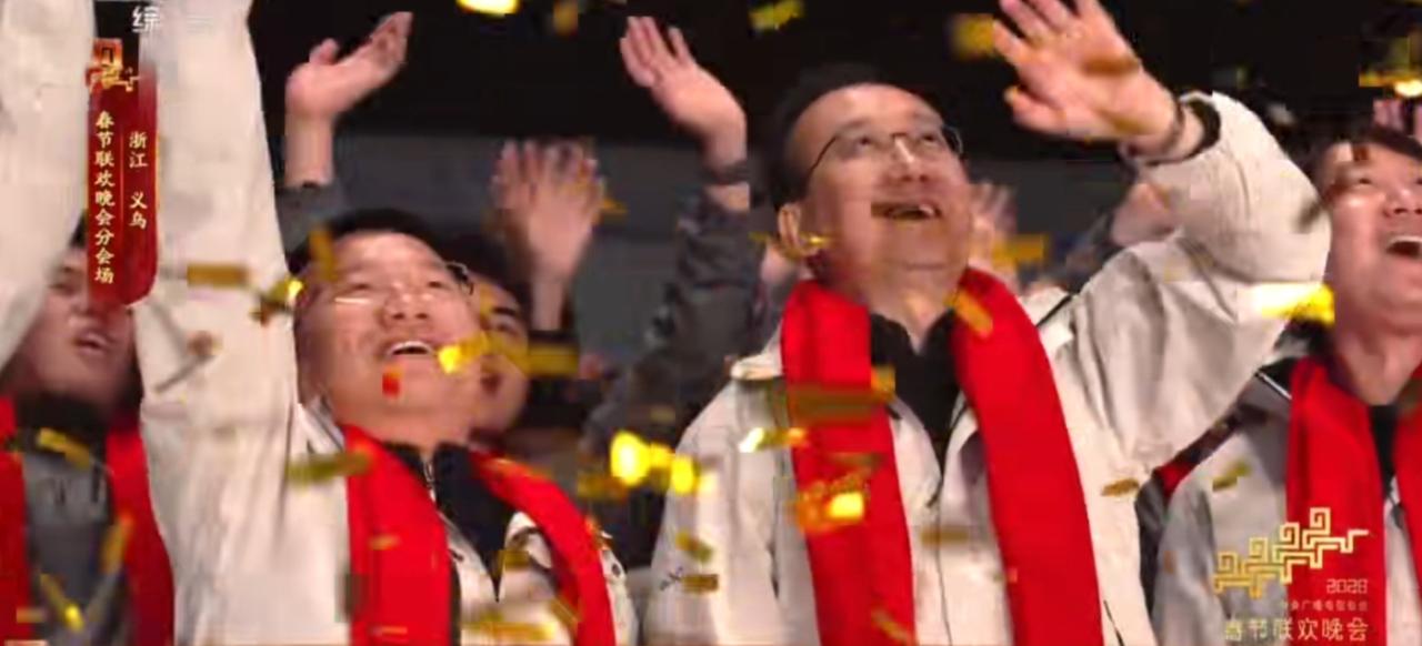 2026年央视春晚浙江义乌分会场上,各界代表齐聚一堂,共同迎接马年新春。现场红旗飘扬,灯光璀璨,大家笑容灿烂,气氛热烈又庄重。不同行业、不同年龄的人们并肩而立,在漫天彩屑中传递团圆与喜悦,展现出同心共庆、奋进向前的新春气象,尽显家国同庆的温暖与豪迈。