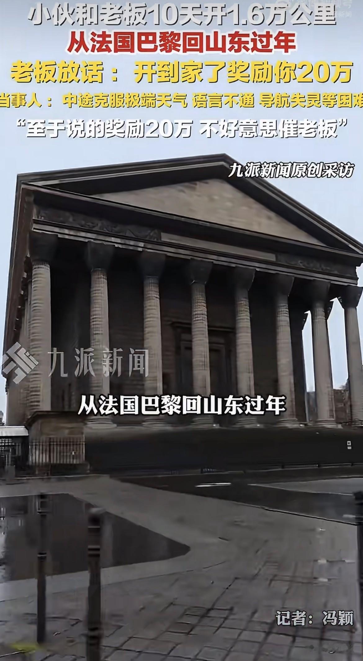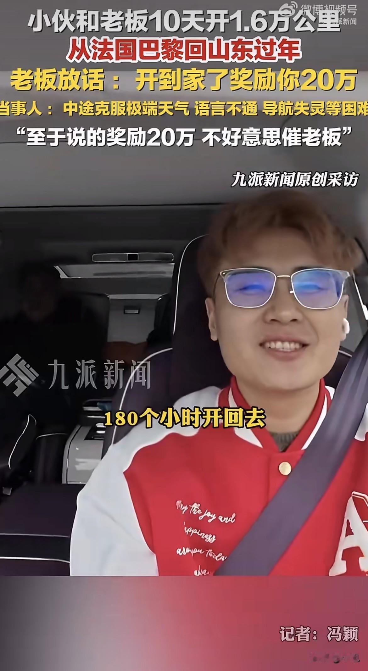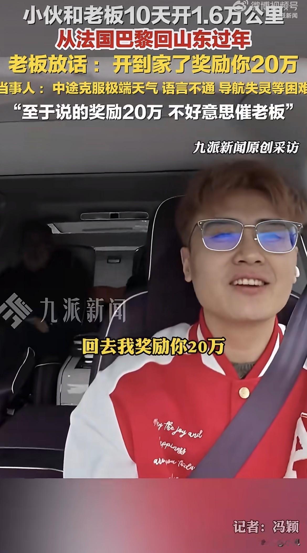 绝了,还有这种老板? 山东一小伙,大过年跟着老板从法国巴黎开车回来,10天干了1.6万公里。 出发前老板放话了:180个小时开回去,到家奖励你20万。 小伙一听,油门直接踩到底。 这一路可不是闹着玩的,经过的国家一个手都数不过来。 走到半路,老天爷先翻脸了,鹅毛大雪劈头盖脸砸下来,能见度不到十米。 接着导航也开始抽风,明明是大路,非往小胡同里导。 语言又不通,想找个人问路,张嘴就是法语,双方大眼瞪小眼。 就这么硬扛着,一路向东,横穿整个欧亚大陆。 白天开,晚上开,困了就在服务区眯一会儿,醒了接着开。 车里的零食袋子空了又满,满了又空,全是服务区买的能量饮料和面包。 小伙说,累是真累,但离家越近,心里越激动。 10天之后,车终于停在了山东老家的门口。 亲戚邻居都围上来看,说这俩人疯了,从那么远的地方开回来。 小伙笑着没说话,脑子里就一件事:那20万,啥时候给? 后来记者问他,他挠挠头说,不好意思催老板。 这话一出,评论区直接炸了。 有人说老板这就是画大饼,真到了就不认账。 也有人说不一定,能跟着老板跨国自驾的,关系肯定不一般。 还有人扒出来,这俩人平时就经常说走就走,开车出差是家常便饭。 小伙自己倒是想得开,说心里就一个念头,回家过年。 1.6万公里,10个日夜,横跨十几个国家,大雪封路,导航失灵,语言不通。 就为了赶在除夕前,推开那扇家里的门。 那20万,最后能不能到手? 你们说,这钱老板该不该给?