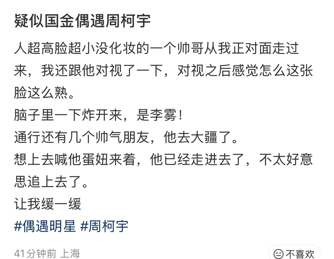 上海逛街偶遇周柯宇网友上海逛街偶遇周柯宇,墨镜🕶️+皮衣冷帽素颜逛街好帅啊周