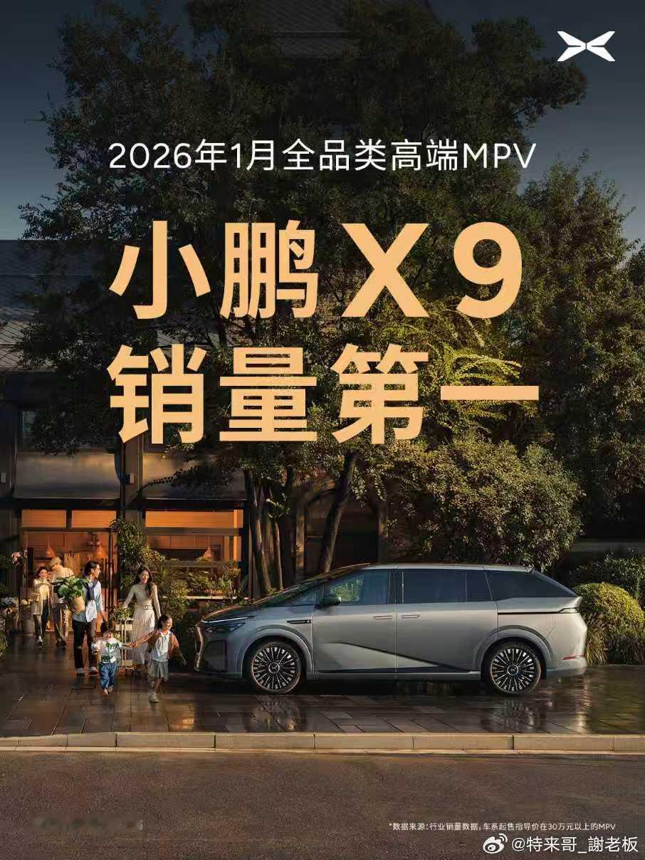 根据汽车之家最新1月销量数据显示,小鹏X9以3971辆的销量成绩,强势问鼎30万元以上高端MPV(不分能源形式)的全品类销量冠军。