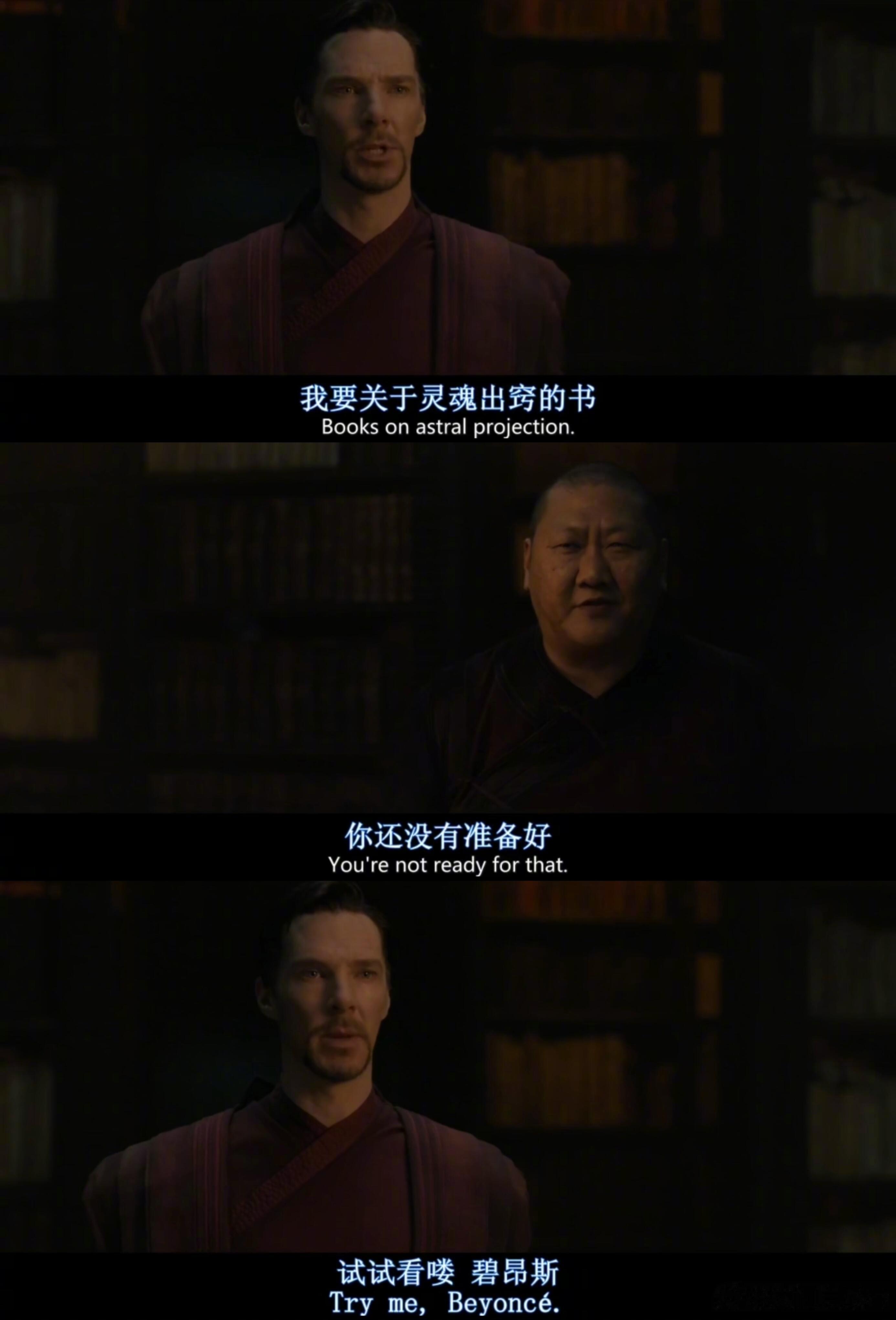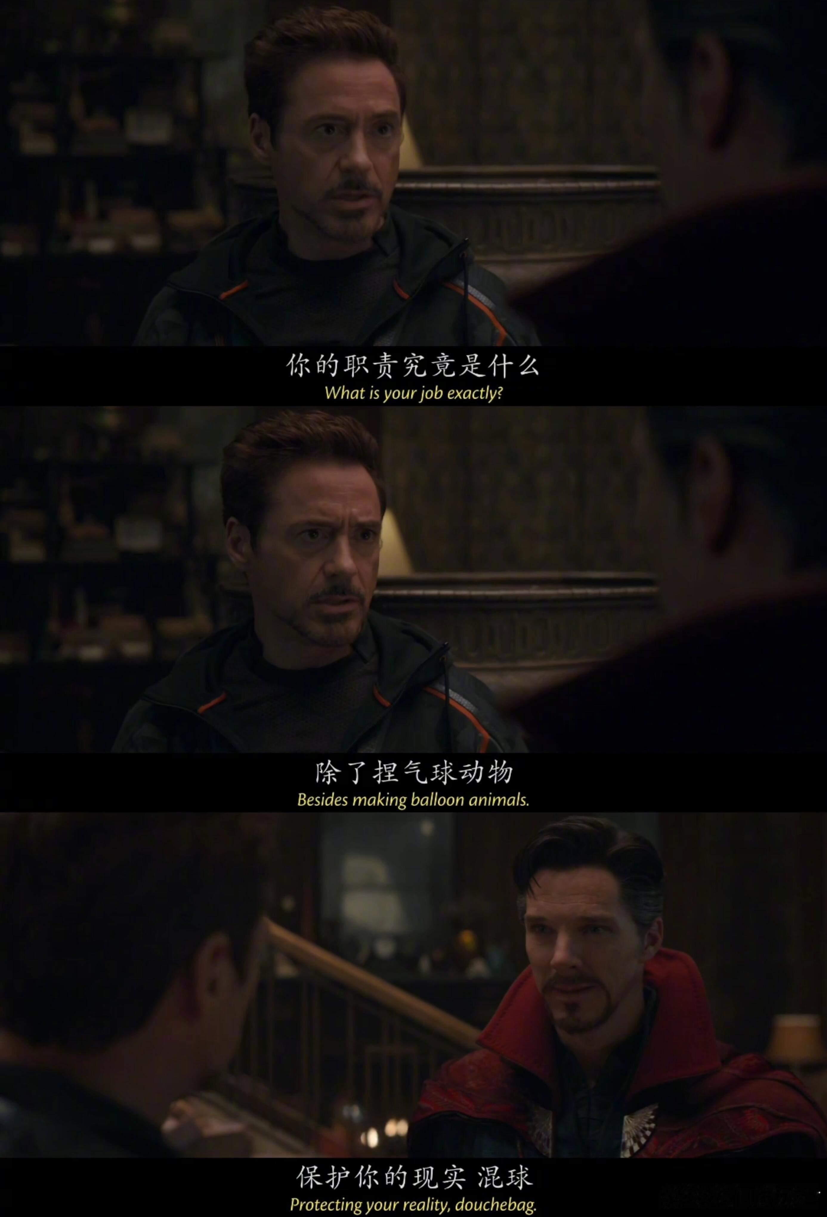 怼黑蝠王:有人头上有叉子怼里德:你们的歌有上排行榜吗怼托尼:有点磕牙/混球怼雷神:你有电话吗怼蜥蜴人:一坨又黏又绿的鬼东西怼克里斯汀:我才不去你那个屠宰场怼克里斯汀:等等,你们不会睡了吧怼古一:你也仅是宇宙里的一颗微小尘埃怼卡西利亚斯:混蛋怼旺达:讲个der理怼老王:碧昂丝笑死了,一条毒舌无差别攻击,都得挨斯特兰奇骂