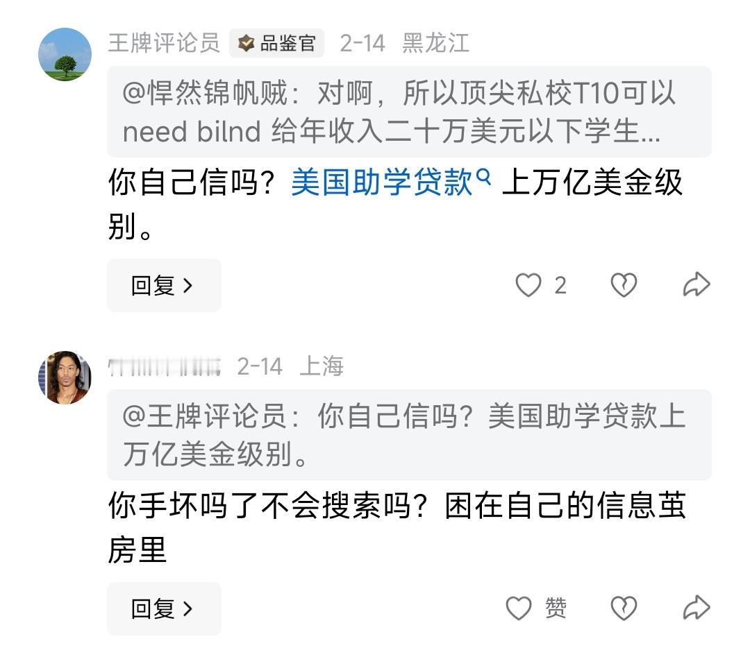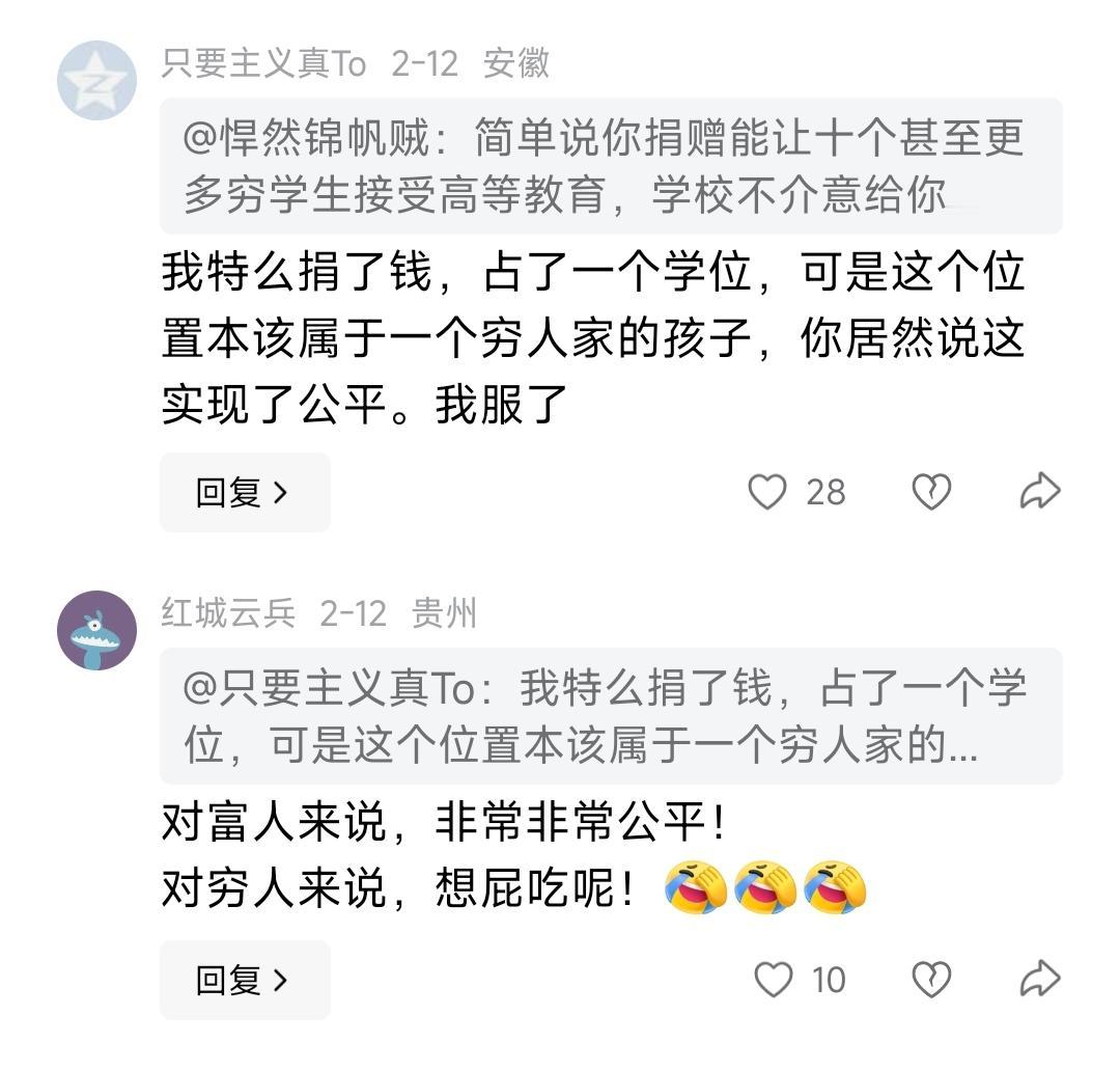 说美国富人捐款换推荐信入学是扩大了教育公平,又说美国TOP10大学会给年收入20万以下的人免费。在本州读书的学费很低。同时否认美国有学贷问题。问信源就是公开消息,没有出处。 在他看来,美国资本在吃人时,漏点汁水给穷人就是天大的功德,是要拿出来大夸特夸的公平。而中国这种学费便宜,有各种勤工俭学减免补助制度的教育制度,不如美国那种为有钱人服务的教育制度公平。