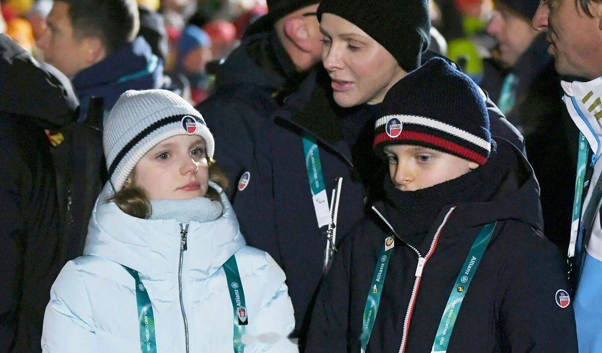 2.15摩纳哥亲王阿尔贝二世、王妃夏琳和龙凤胎在米兰冬奥会,项目是钢架雪车混合