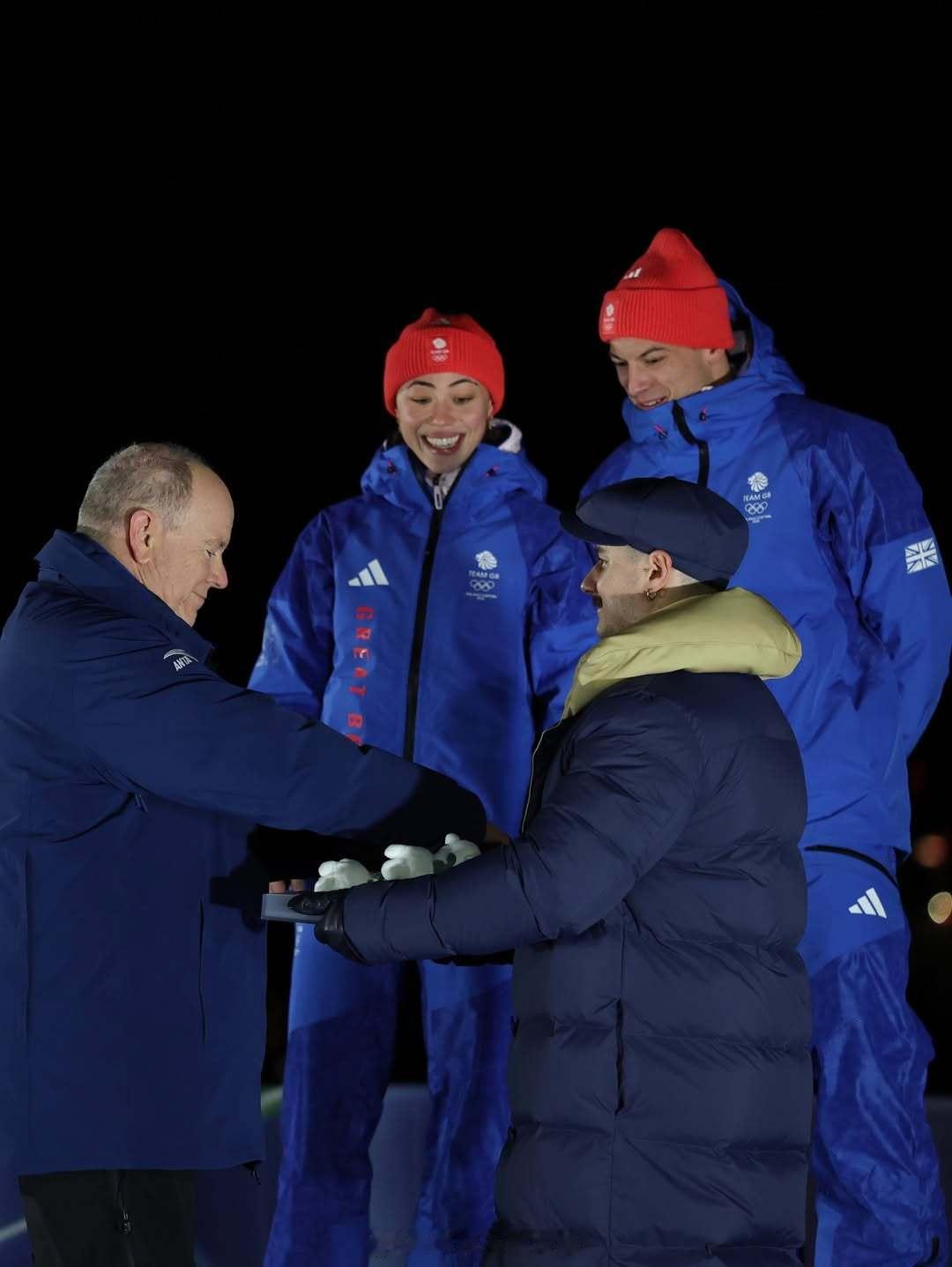 2.15 摩纳哥亲王阿尔贝二世、王妃夏琳和龙凤胎在米兰冬奥会,项目是钢架雪车混合团体,阿尔贝负责赛后颁奖
