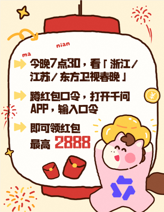 千问大年初一又发红包啦~千问江浙沪春晚给你发红包,家人们19:30务必准时蹲住江苏、浙江、东方卫视春晚,ipad、手机、电脑都用上!只要输入口令就能领,非常简单!盲猜既然是春晚,口令肯定跟贺岁、明星挂钩...反正我已经准备好了,边看节目边抢就完事了!千问没有免单卡也能天天减免