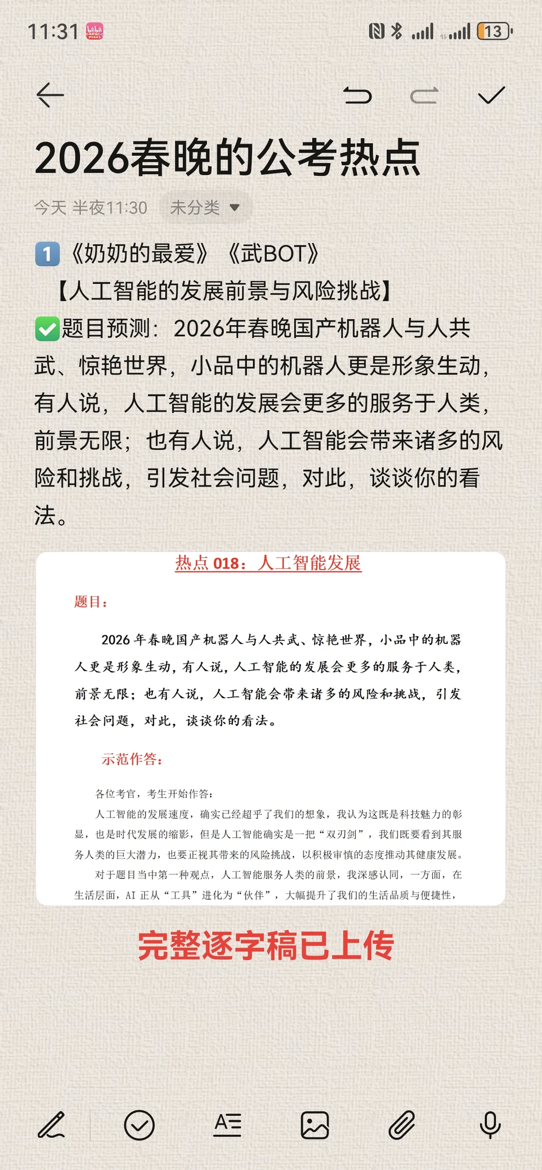 ✅题目预测:2026年春晚国产机器人与人共武、惊艳世界,小品中的机器人更是形象生动,有人说,人工智能的发展会更多的服务于人类,前景无限;也有人说,人工智能会带来诸多的风险和挑战,引发社会问题,对此,谈谈你的看法。