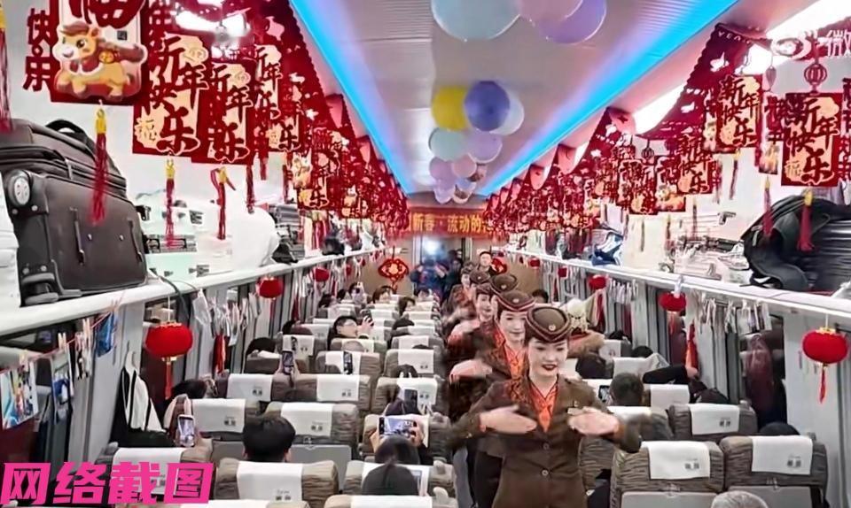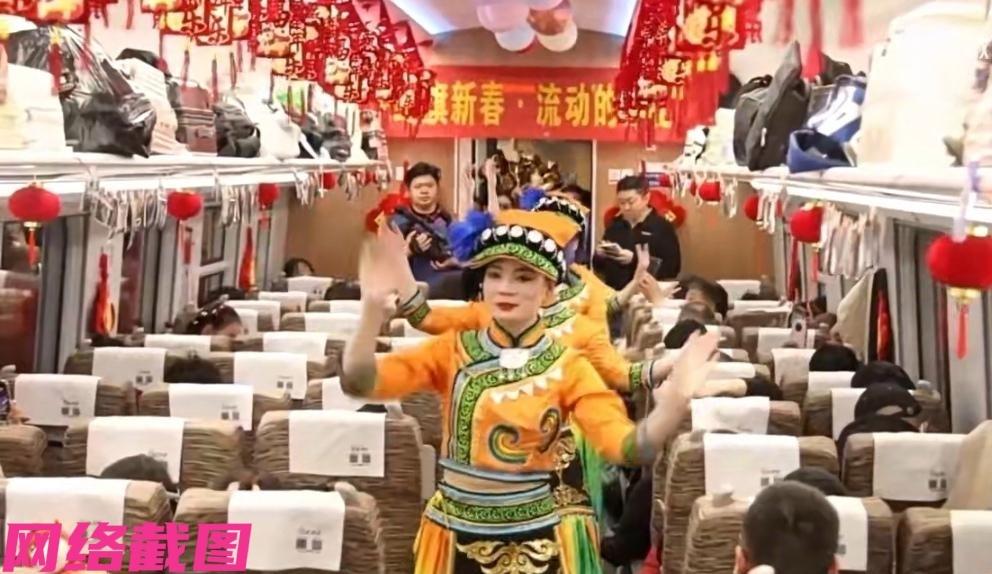 有成渝高铁列车上开始一段春晚式的演绎,为给这一路还在路途中的乘客,以最为温暖的演绎。 这里在小小的列车厢内上演出歌曲,魔术,朗诵等等表演,现场的热烈氛围点燃了众多乘客的参与,瞬间感受过年的气息流淌,还有众人心里暖暖的意味,这一刻被列车小小春晚而征服在路途中的大众,神情洋溢出满满的喜悦,最后还有民警写福送福,还有给孩子们送来红灯笼,一派祥和的高兴与喜庆,这一刻全部展露无疑。 这眼前所有人都能感受到在温暖的途中,过年的春节让所有人目睹在这其中,小小的节目与众人互动里带着洋溢的色彩,落定在众人的身体言行里,感觉中化为记忆会有温故。 这一趟的乘客是分外满意,在这特殊的春运里,众人看到不一样的一幕,对于所有在途中的众人是欣慰,是心情中带着的感动,让一段春运的岁月刻画如此美妙又这样令人感动,这是所有人心里被摩挲出最好的美意,然后也被带进千家万户中照耀这美好的新年。