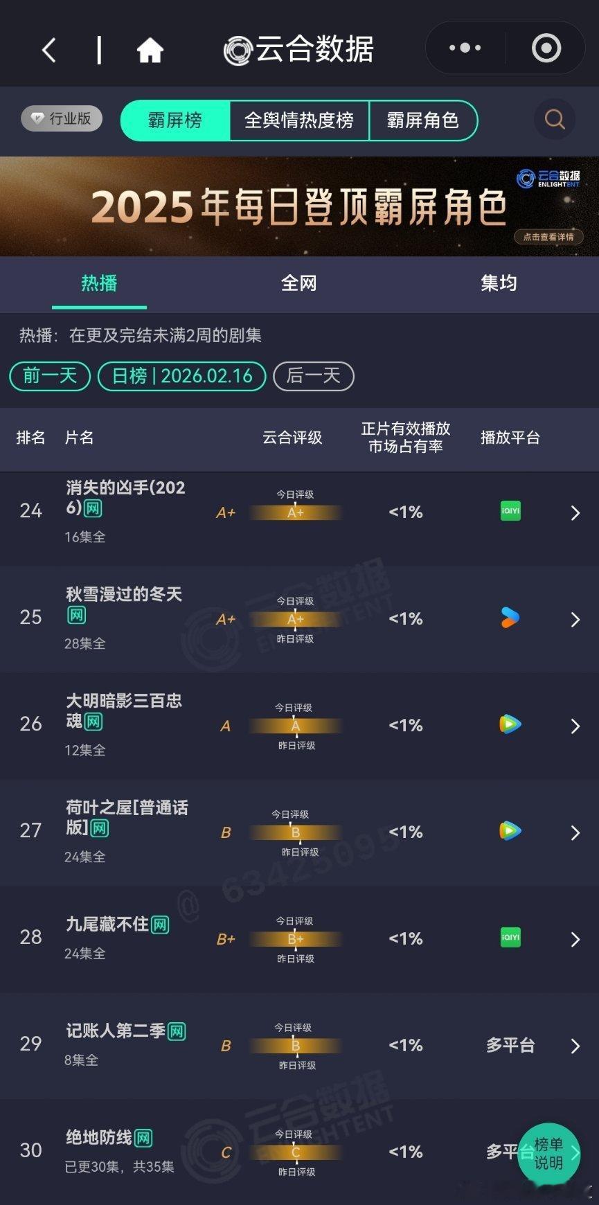 除夕当日的云合播放占比云合看剧人全面减少,正常