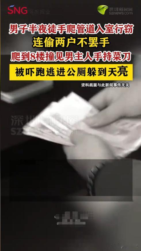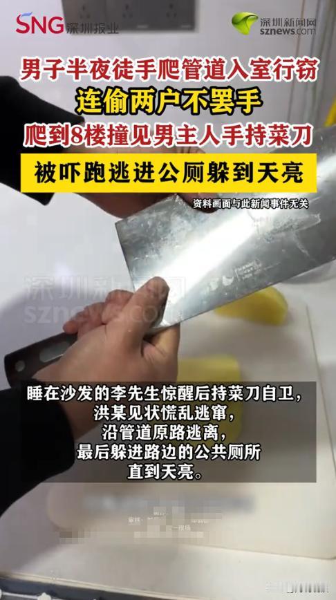 “太惊险了!”近日,一男子半夜徒手攀爬外墙管道,潜入居民楼入室行窃,连偷两户仍不满足,继续爬到8楼作案时,竟撞见男主人手持菜刀自卫,当场被吓得魂飞魄散,仓皇逃窜后躲进路边公厕,直到天亮后被警方抓获,网友:大快人心! 据媒体1月27日报道,这天深夜,男子趁着居民都在熟睡,动起了歪心思。他凭借徒手攀爬的“本事”,顺着居民楼的外墙管道往上爬,先后潜入两户人家实施盗窃,得手后仍不知足,继续往更高楼层攀爬,打算再偷一户。 当他爬到8楼,悄悄潜入李先生家时,恰好惊醒了睡在沙发上的李先生。李先生察觉家中有陌生人,瞬间警惕起来,随手拿起身边的菜刀自卫,大声喝止。男子见状,当场吓得惊慌失措,哪里还顾得上偷东西,转身就沿着管道原路疯狂逃窜。 男子一路跑到路边,见无处可躲,便钻进了附近的公共厕所,一直躲到天亮。而李先生发现家中财物被盗后,立即报警,警方根据监控线索,很快锁定了该男子,并在公厕内将其抓获。 民警提醒,夜间睡觉异地昂要锁好门窗,尤其是低楼层住户,可以安装防盗窗、防盗报警器等设施,发现家中有陌生人闯入时,一定不要盲目冲动,在保证自身安全的前提下,及时报警寻求帮助。 信息来源:《[男子半夜徒手爬管道到8楼入室行窃]撞见男主人拿菜刀被吓跑逃进公厕躲到天亮。