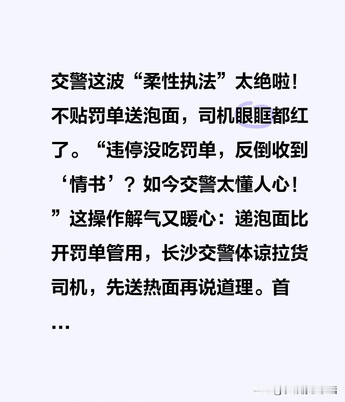 交警这波“柔性执法”太绝啦!不贴罚单送泡面,司机眼眶都红了。 “违停没吃罚单,反倒收到‘情书’?如今交警太懂人心!” 这操作解气又暖心: 递泡面比开罚单管用,长沙交警体谅拉货司机,先送热面再说道理。 首违免罚尽显温情,外地车不熟路况,警告即可,何必罚两百? 治标更要治本,罚款非目的,让人自觉守规才是本事! 这种有温度的执法,必须大力点赞!你遇过这么温柔的交警吗? 觉得暖心就点赞✅ 转发⭐️ 传递更多正能量! 违停开罚单 人性化罚单 人性化执法