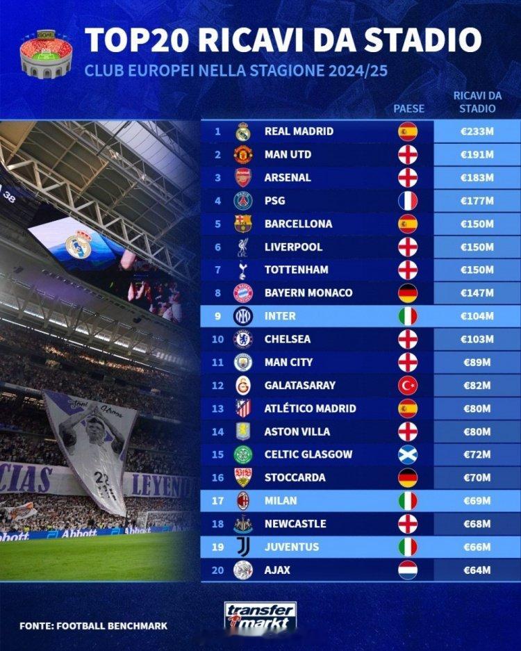 德国转会市场列出上赛季欧洲俱乐部主场门票收入排名,皇马2.33亿欧居首,曼联1.91亿欧次席,阿森纳1.83亿欧排名第三 英超联赛 阿森纳著名教授