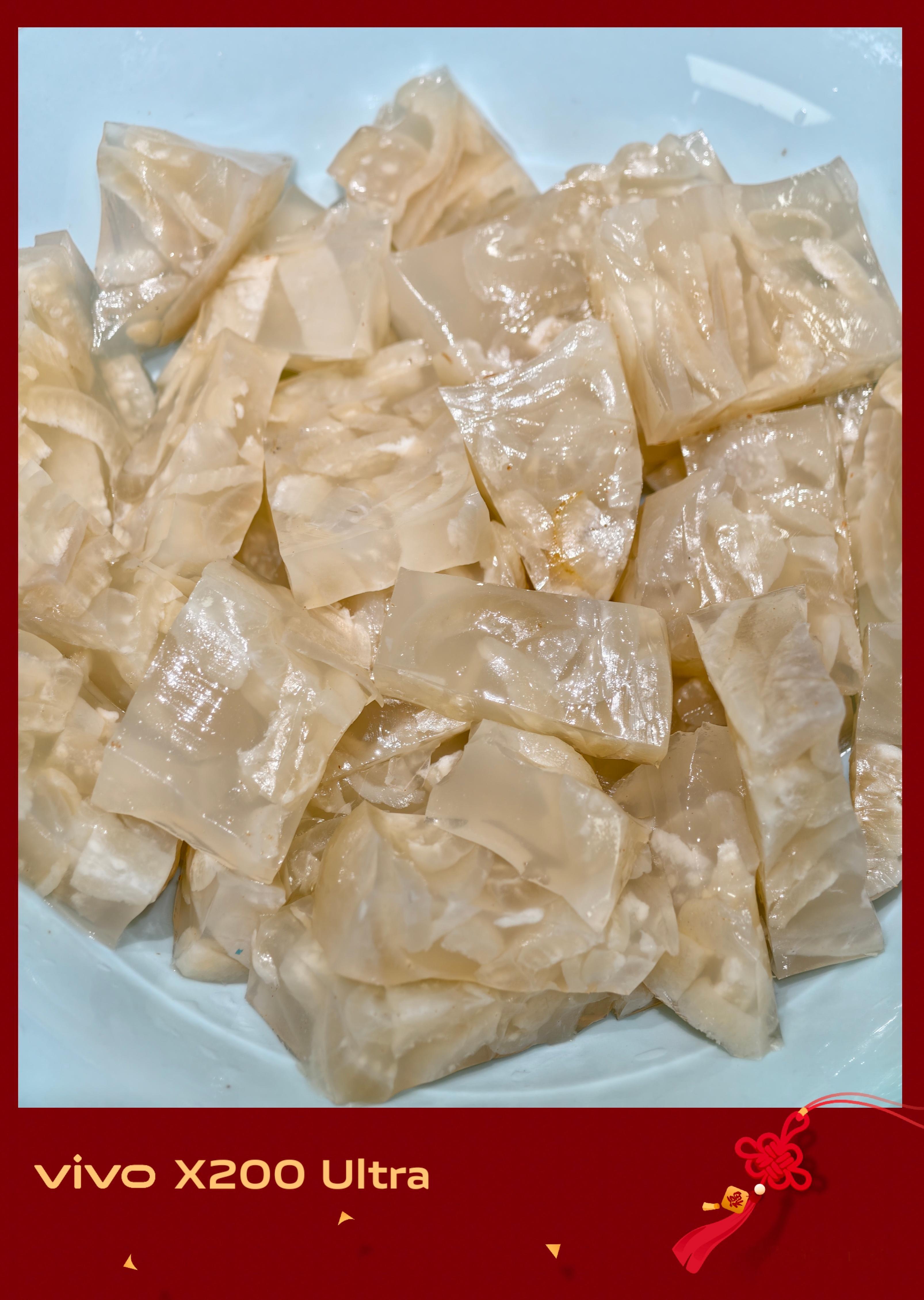 东北过年餐桌必备菜品「猪皮冻」。蘸点蒜酱贼带劲