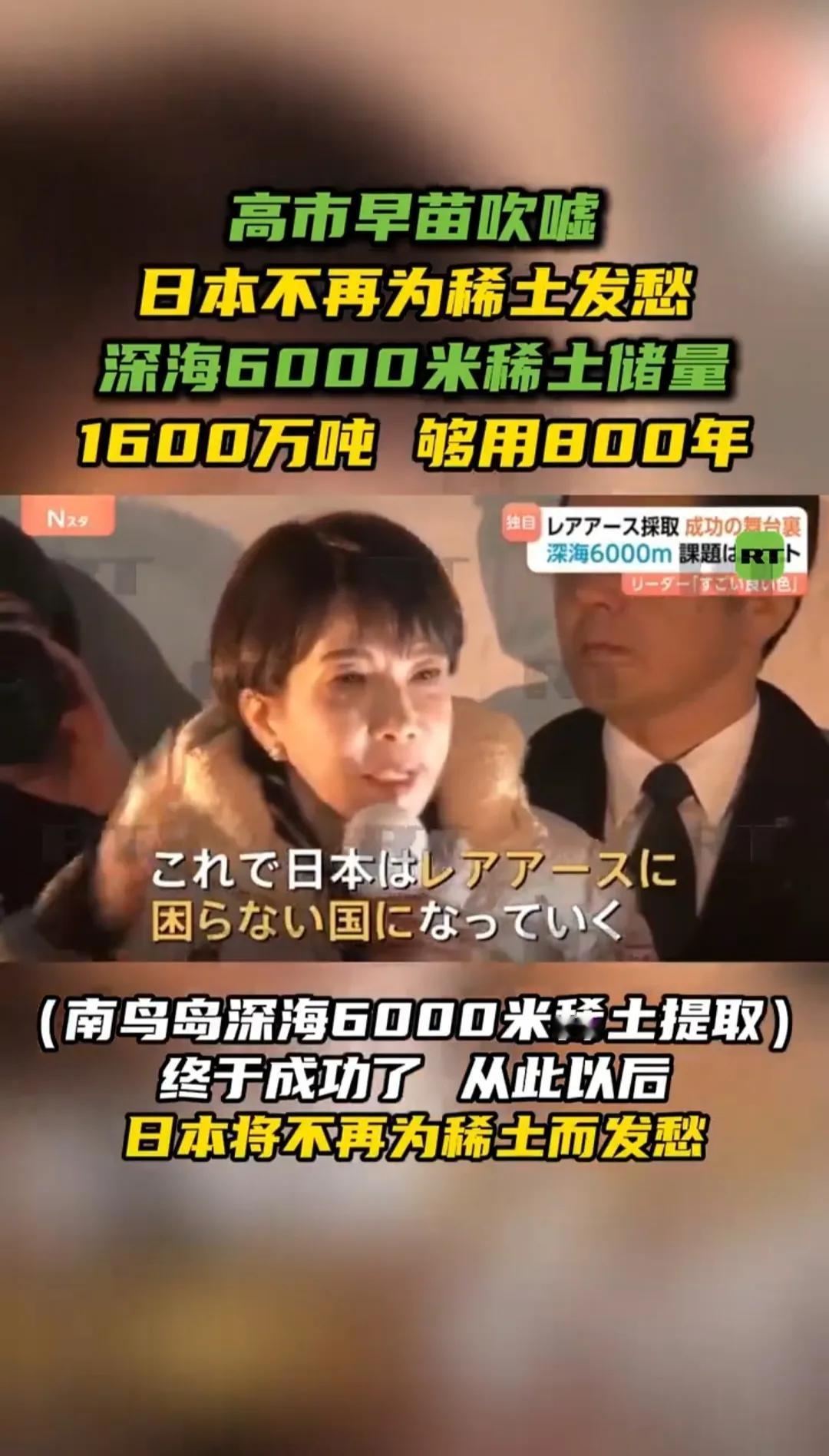 高市早苗又发癫了。不提采矿难度、分离和提纯技术、能否规模化和产业化、对环境的污染程度,也不提具体成本,只说海底稀土多,完全大忽悠。 既然高市公开表示日本再也不愁稀土,那从今以后一克稀土也不给日本卖了。