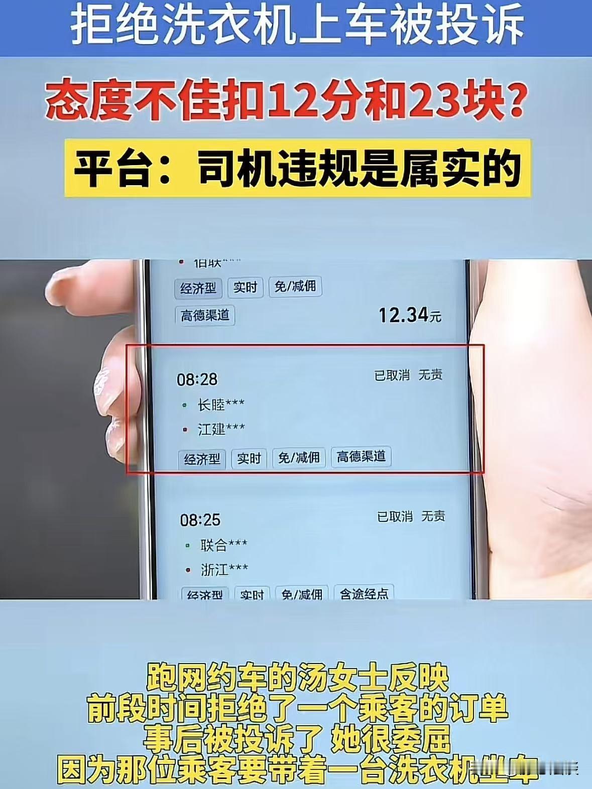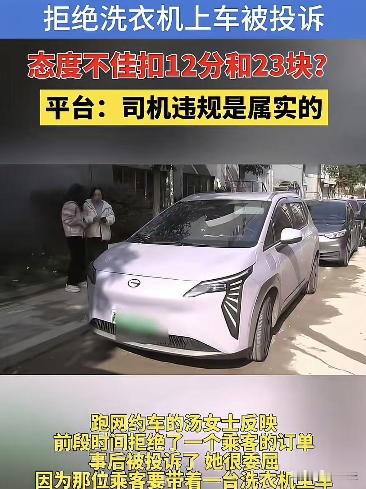太气人!浙江杭州,男子购买了一台洗衣机后,想打网约车带回家,司机接单赶到后,告知男子后备箱太小装不下,男子见状直接取消订单,事后气不过,将司机投诉了,说网约车司机态度不好,平台扣了司机12分罚了23元,司机觉得冤枉,自己的车就是放不下,自己不能硬装,是男子故意差评,她咽不下这口气,申请退还自己23元。网友:那么大件货就不能叫个货拉拉吗?还好意思投诉,要脸不! 2月11号早上8点多,男子带着一台全新洗衣机,想把东西弄回家。 他不没叫货拉拉,竟然点开手机,叫了一辆普通网约车。 而接单的汤女士刚上线,平台就把这单派给了她。 上车点在丁桥那边,全程也就3公里左右,是个短途单。 路程虽然不远,汤女士还是赶过去,但早高峰路不好走,光开到男子上车点,就花了七八分钟。 可一到地方,汤女士当场就愣住了,男子身边,立着一台超大的洗衣机。 可汤女士开的就是普通家用轿车,后备箱空间就那么大,这洗衣机,根本塞不进去。 汤女士见男子年龄也不是很大,就跟他解释自己这是轿车,空间太小,洗衣机拉不了,从新叫个大车。 男子也没多说什么,当场就拿手机操作把订单取消掉。 整个过程,双方语气平和,没有不耐烦,没有甩脸子,更没有吵架。 而平台认为这次取消是男乘客原因,司机没有责任,平台还给汤女士结算了2块5毛1的空驶补偿费。 汤女士以为这事完事就拉倒了,所以继续接单跑车。 可谁能想到,该男子心眼小到离谱,转身就在平台上把司机投诉,投诉理由更是:服务态度不好! 汤女士收到通知后当时就懵了,整个人又委屈又不解。 她从头到尾好好说话、好好解释,连一句重话都没有,既没争执,也没口角,怎么就莫名其妙被扣上服务态度不好的帽子? 她想破头都想不明白,自己到底哪里做得不对。 更让她接受不了的是,时间点太寸了,2月5号到2月12号,正好是平台的一个考核周期。 在这之前,汤女士已经莫名其妙被投诉过两次,理由都很牵强,根本不是她的问题。加上这一次,刚好三次投诉。 平台直接按照规则判定,汤女士有不少于三位乘客反馈服务不达标。 所以认定汤女士有责,二话不说扣了12分服务分,还罚了23块钱违约金。 23元不多,可汤女士憋屈,自己开网约车五年有余,一直兢兢业业,平易近人。 平时接单,除了问一句手机尾号确认乘客身份,几乎不跟乘客多聊一句,生怕哪句话说得不对让乘客不舒服。 可就算这样,还是总被人无缘无故给差评、乱投诉。 汤女士越想越气,自己要真跟客户吵架了、闹矛盾了、服务不好了,你投诉我,我认。 可这单,自己明明无责,沟通顺畅,订单都是正常取消的。 你反手一个投诉,平台连认真核实都不核实,直接就处罚我,这对自己公平吗? 《民典法》第577条:当事人一方不履行合同义务或者履行合同义务不符合约定的,应当承担继续履行、采取补救措施或者赔偿损失等违约责任。 平台无依据扣分罚款,违反双方服务协议,汤女士可主张撤销处罚、赔偿损失。 为了争这口气,为了一个公道,气的汤女士找到媒体发到网上,想让大家给评评理,还她一个清白。 记者随后致电了平台客服,对方给出的回应是:乘客投诉服务态度差之后,平台会对司机启动一个为期7天的综合评价考核。 会参考这段时间里多名乘客的反馈来最终定责。 至于这次的23元罚款,可以向领导申请后的特殊处理返还。 但之前扣掉的12分服务分,平台依旧认定违规事实成立,没办法返还,也不能撤销。 还补充说明,一般情况下,单凭一名乘客的投诉,是不会直接判定司机有责。 最终结果都是结合整个考核周期里多位乘客的评价综合得出的。 可道理归道理,心里的委屈,却没那么容易抹平。 这件事一被说出来,网友们直接炸锅了,评论区一边倒地替司机说话,把这位投诉的男乘客说得明明白白: 那么大一个洗衣机,心里没数吗?打网约车拉家电,怎么想的? 装不下就投诉人家态度不好,这不是纯纯恶意搞人吗? 还有人说,男子明摆着薅司机羊毛,而平台不看前因后果,随便一个投诉就罚司机,也太不讲理了! 最后平台把23块钱罚款退了回来,可被扣的服务分,却没能恢复。 汤女士面对这样的处理结果,虽然心里不服,但是也不想折腾。 属于被扣掉的服务分,只能靠以后多跑单子,慢慢把分补回来。 不得不说,做人多点良心,别为了一点小事恶意投诉别人,谁的生活都不容易。 对此,你怎们看男子带洗衣机打网约车投诉这件事! @静心法谈 学法辨是非,慬法不吃亏。
