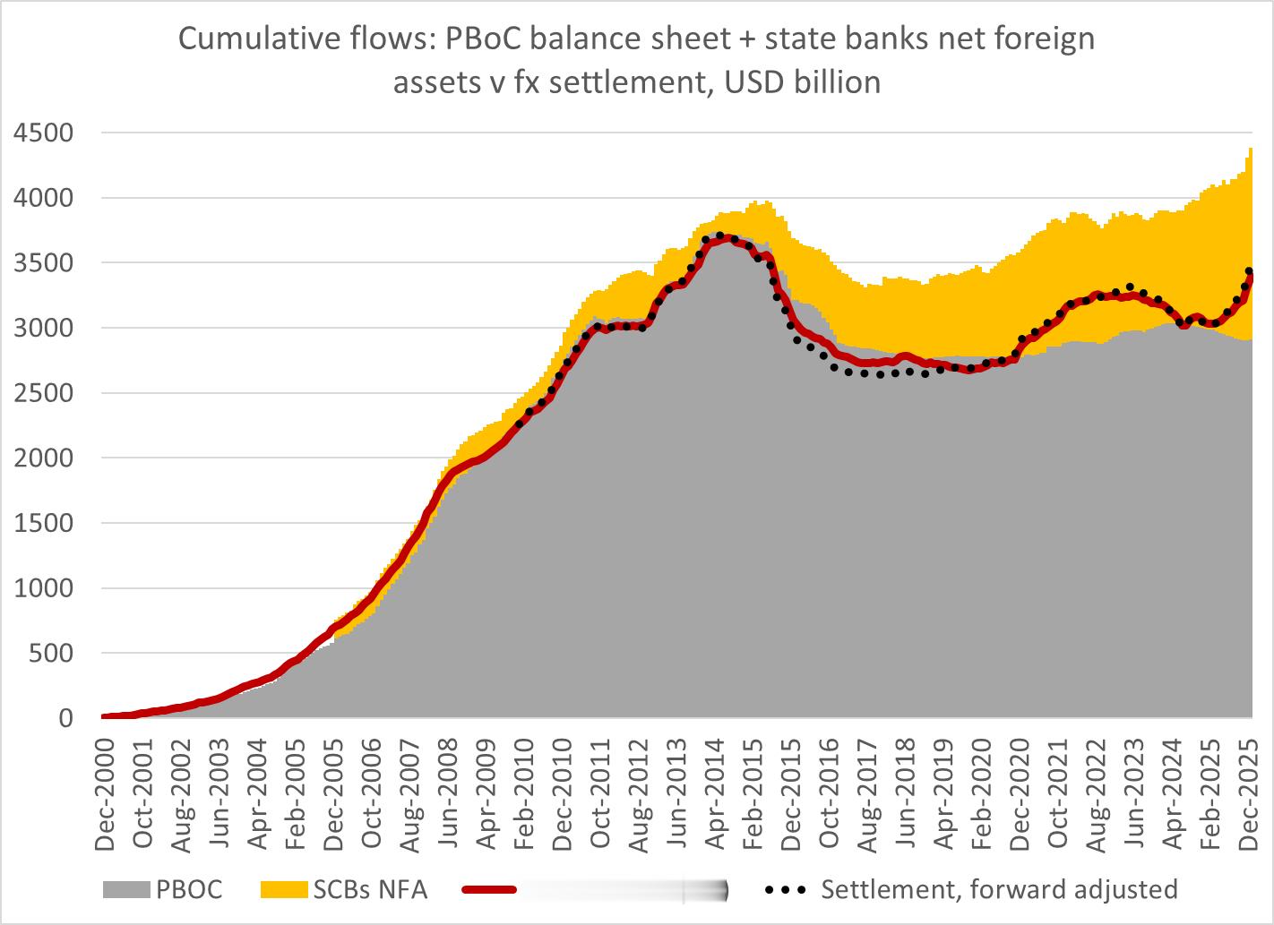 图一,格隆汇的这张图非常误导人,以为中国大幅抛售美债,实际上你获得了大量顺差就必然持有逆差方的资产,股票或者债券或者房地产等等图二就可以看的清楚了北京实际上只是把外汇储备委托给了国有银行代管,并转出了由美国机构托管的账户。央行的外汇储备加上国有银行持有的美债等美国资产创了历史新高。
