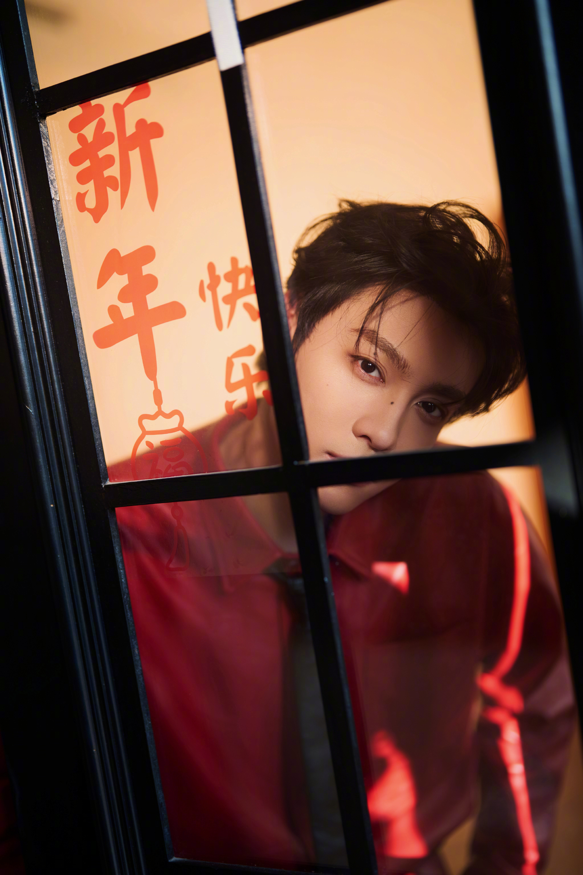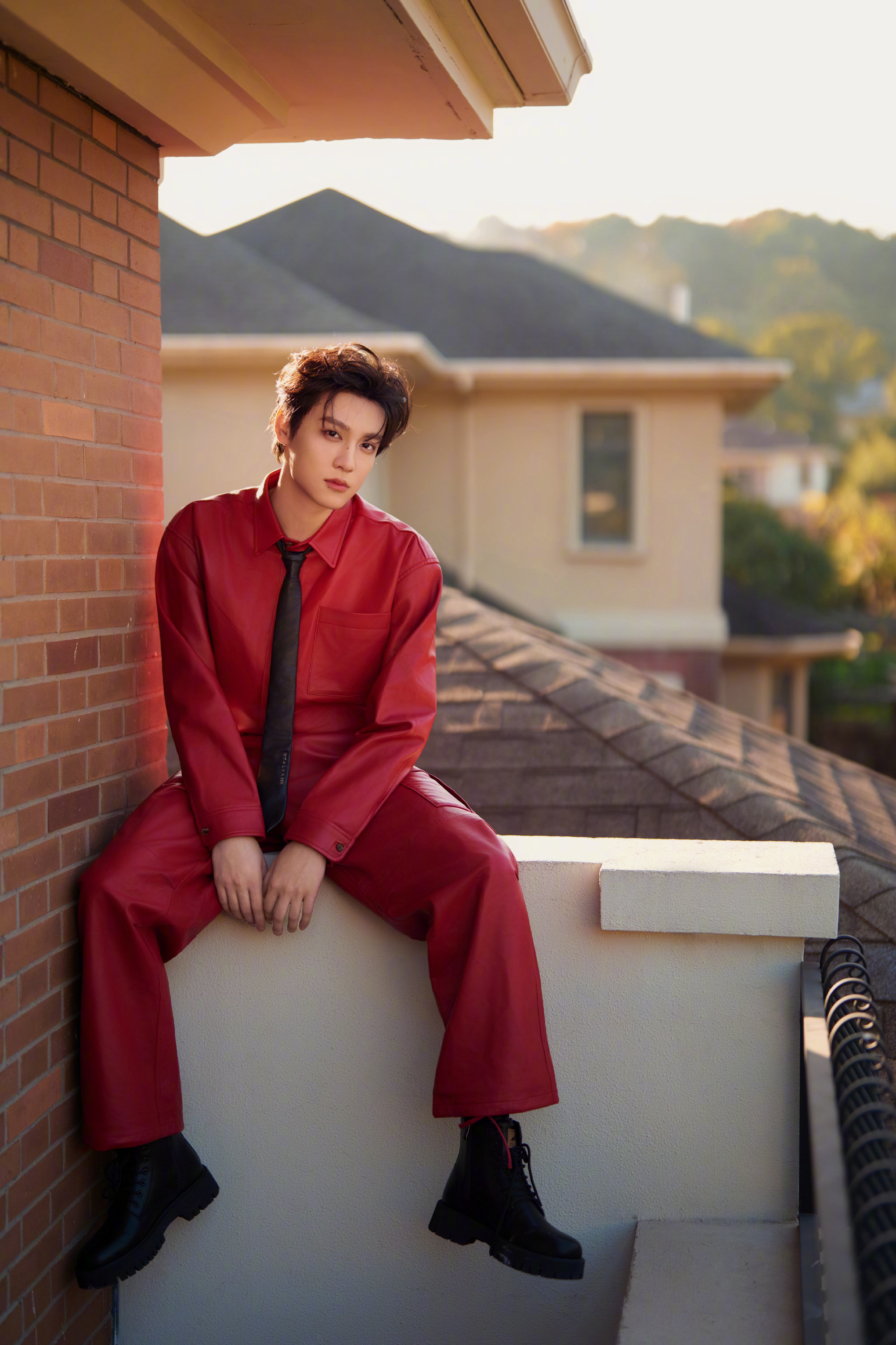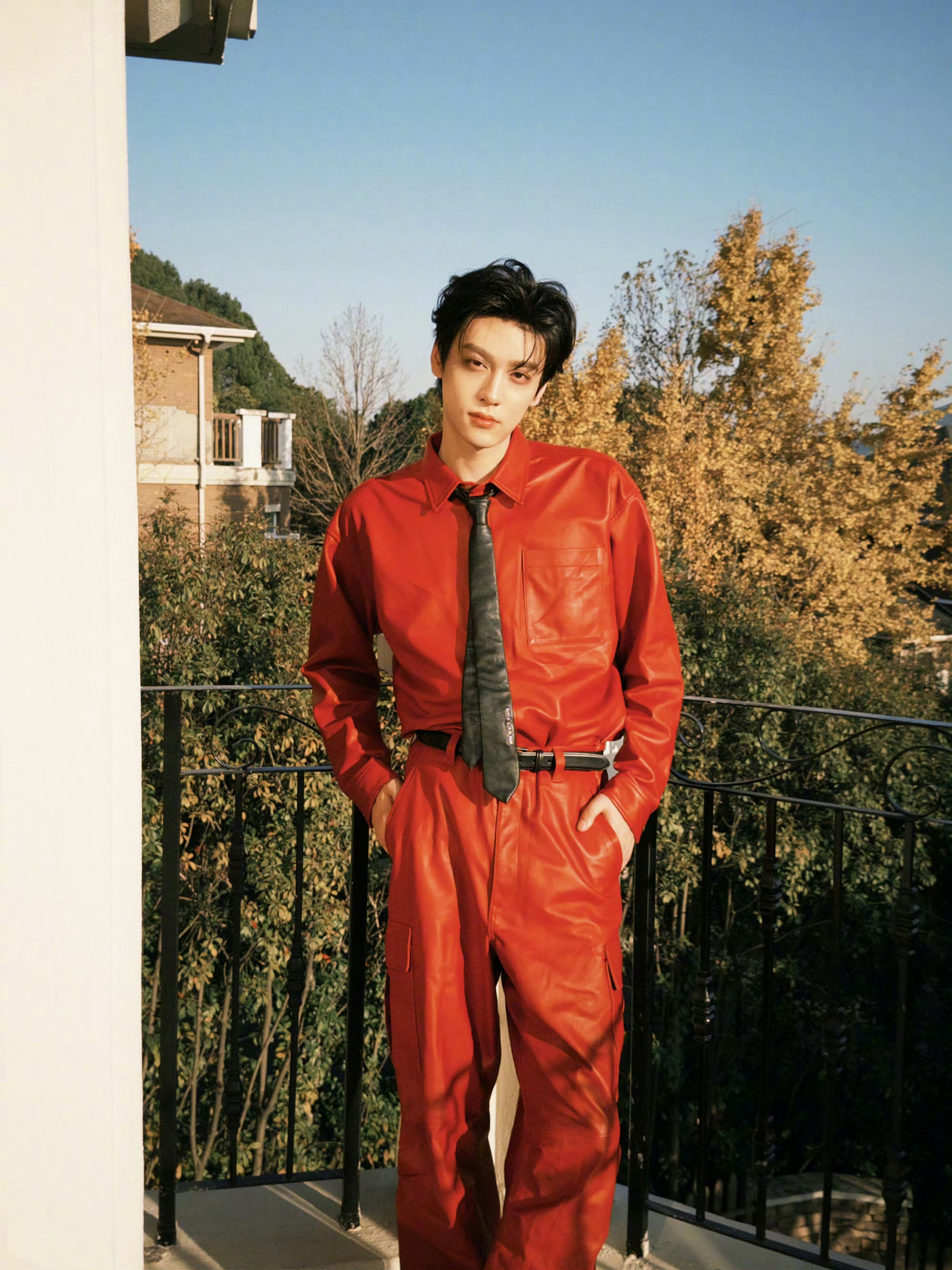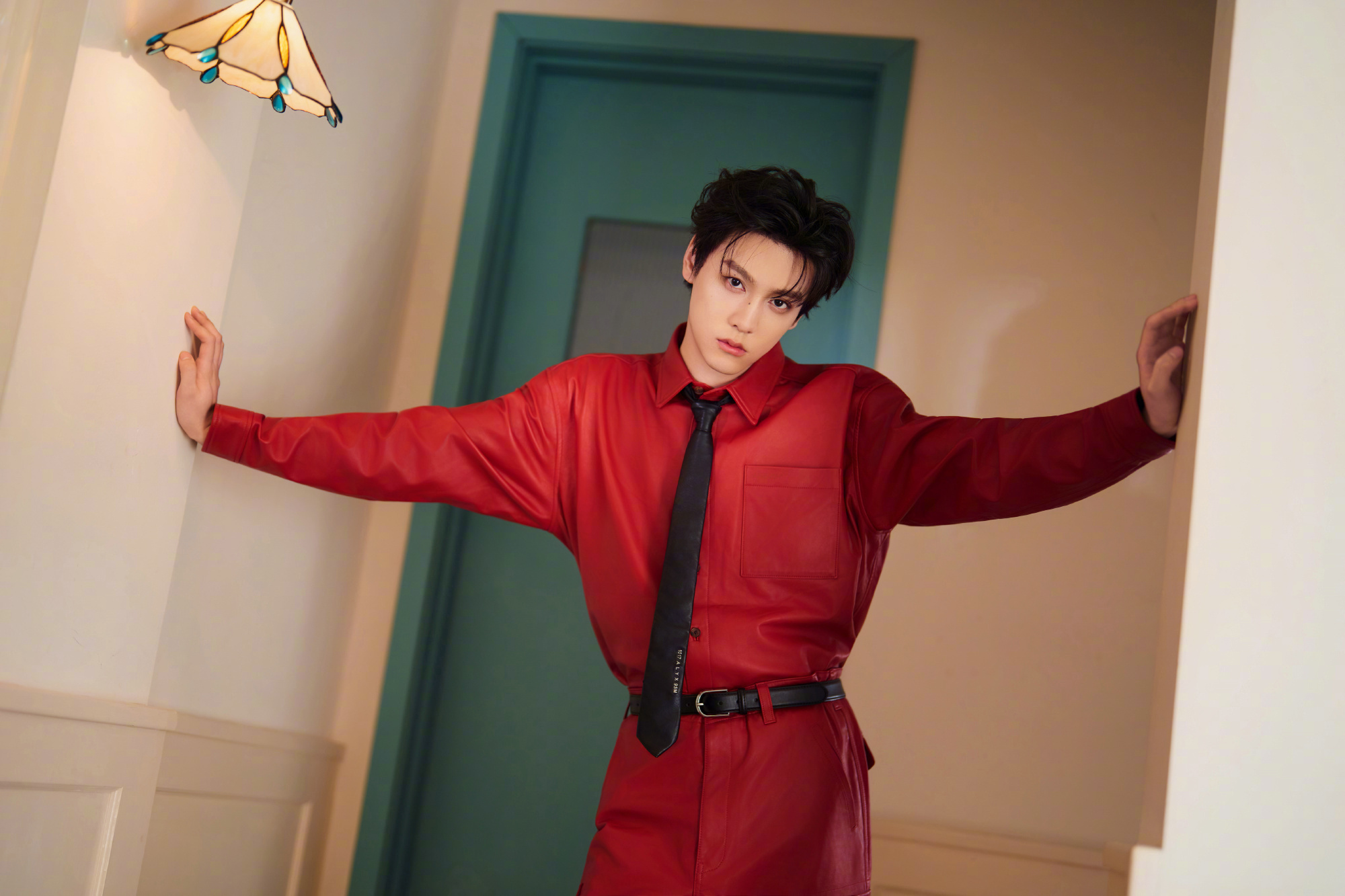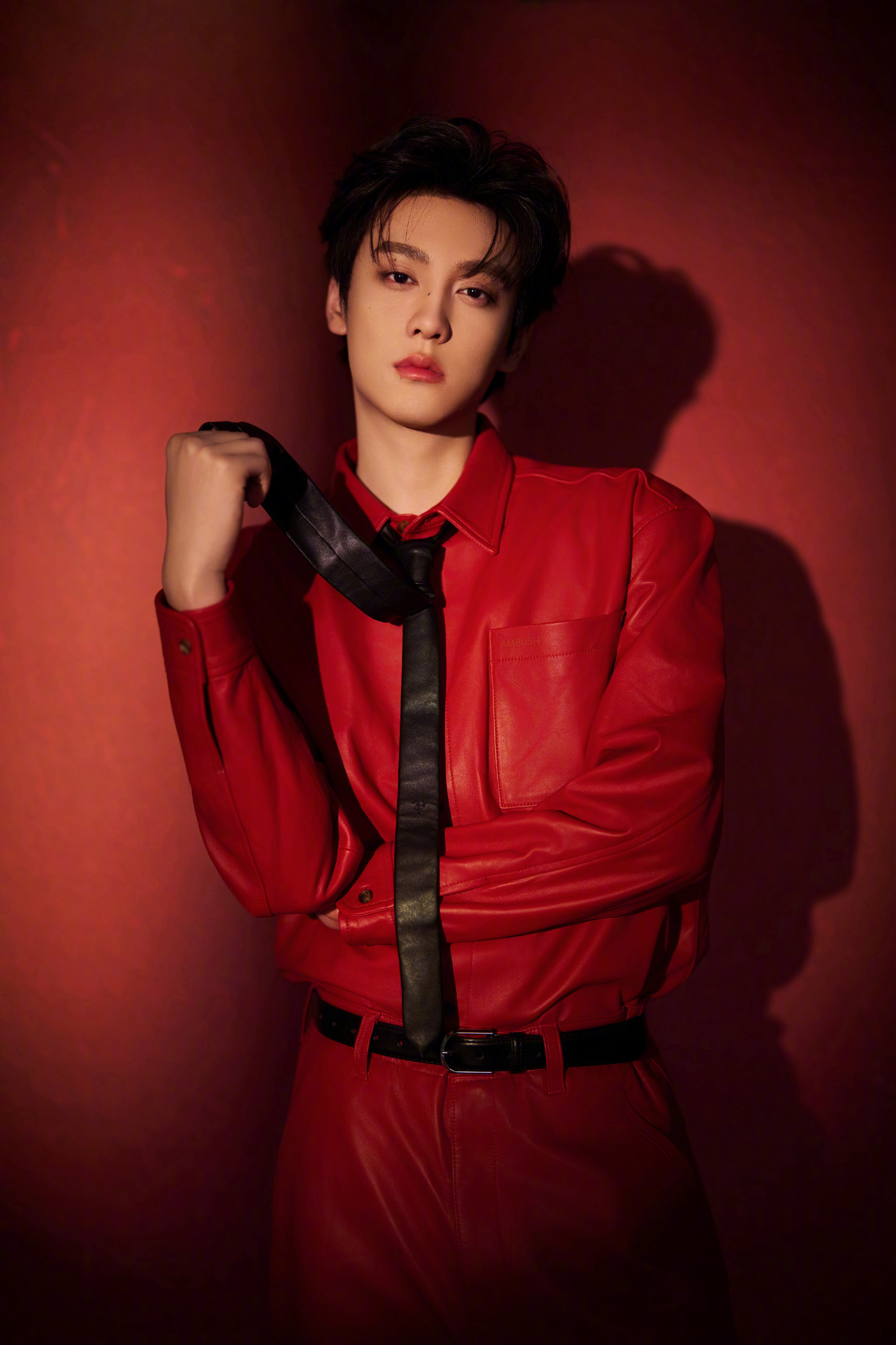 田栩宁新春大片,身穿AMBUSH 25秋冬红色皮衣套装,搭配黑色领带,硬挺的版型把少年的英气衬得恰到好处,这身造型既符合新年“红红火火”的氛围,又透着股不羁的时尚感。新春茶话会