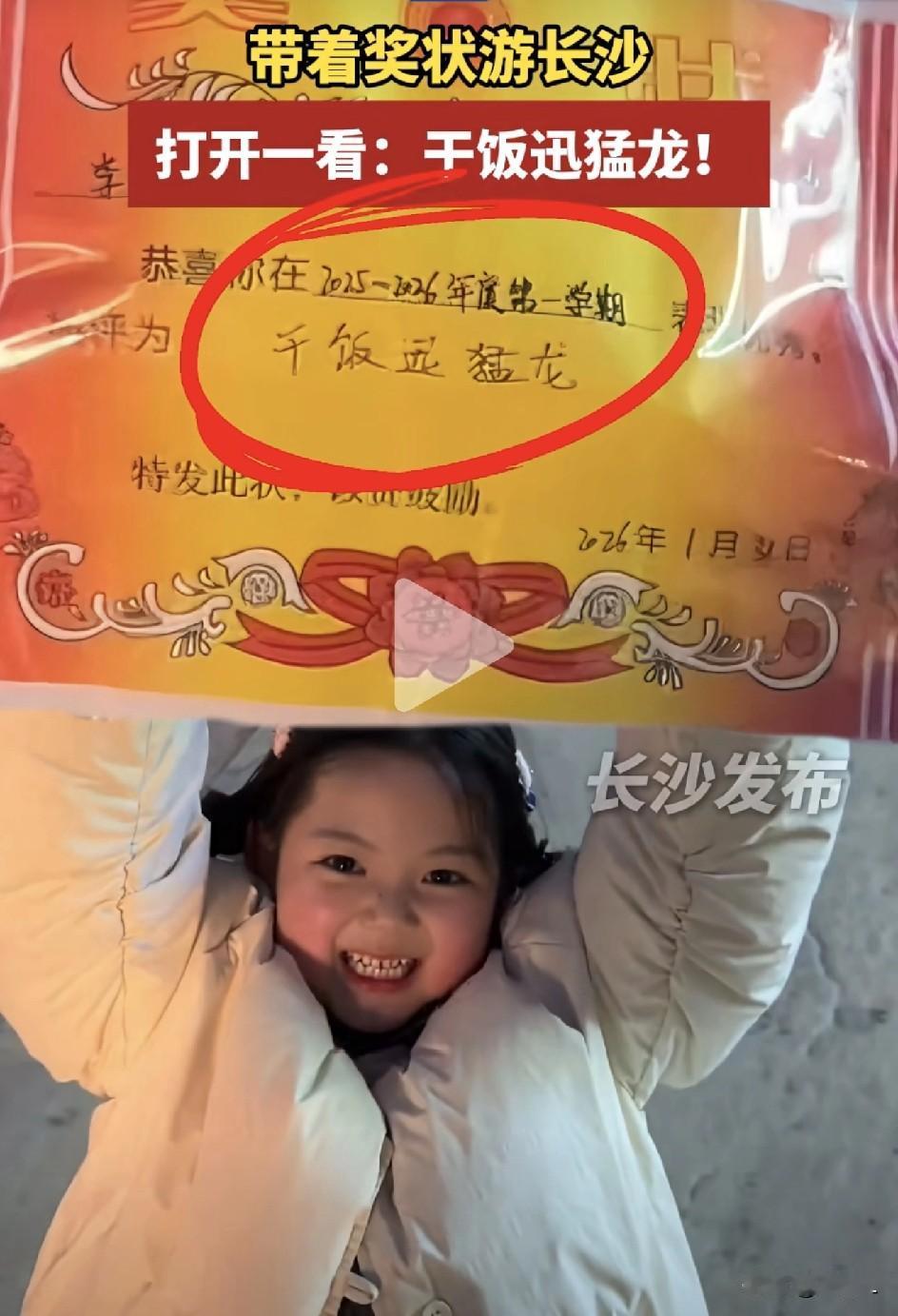 小女孩带奖状游长沙,全程高举不肯放,看清内容笑喷全网! 近日,河南一对夫妻带女儿来长沙旅游,没想到孩子出门还不忘带上自己的奖状。 坐高铁、逛景区一路,小女孩都把奖状紧紧举着,舍不得收起来。 也正因为这张奖状,她一路特别受大家关注,景区工作人员都很照顾她,各种互动活动优先选她参加,运气简直好到爆棚。 不少人都好奇,这孩子到底拿了什么大奖?让她如此珍视和骄傲! 结果妈妈笑着把奖状亮出来,上面写着:干饭迅猛龙。 网友直接笑翻:还以为是三好生,原来是吃饭第一名! 不过,大家都说,这才是小朋友最该得的奖,能吃能玩、开开心心,比啥都强! 不得不说,我们现在的教育,真的转变很大,发现每一个孩子的优点,并广而告之,让孩子知道她的每一个发光点都有人看见! 好像没有什么实质的用处,但却会在无形中在孩子的心里种下爱与希望的种子,自信满满! 素材来源:长沙发布,侵联删!