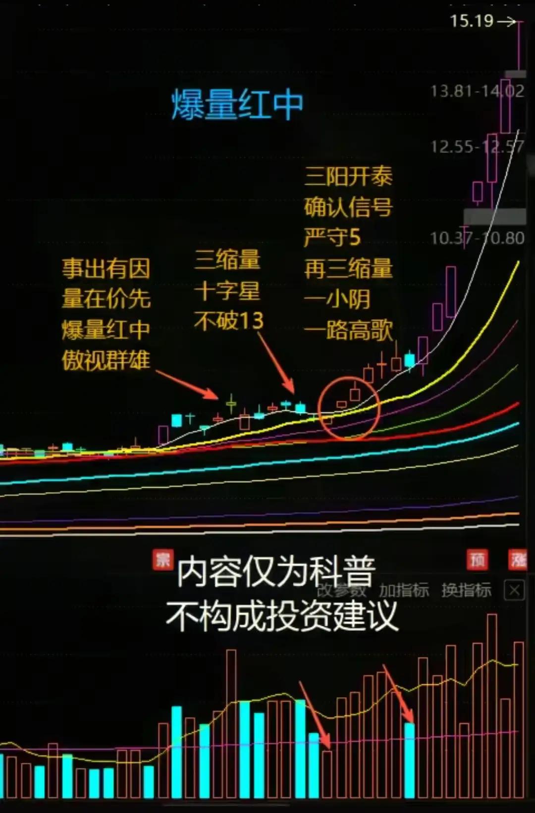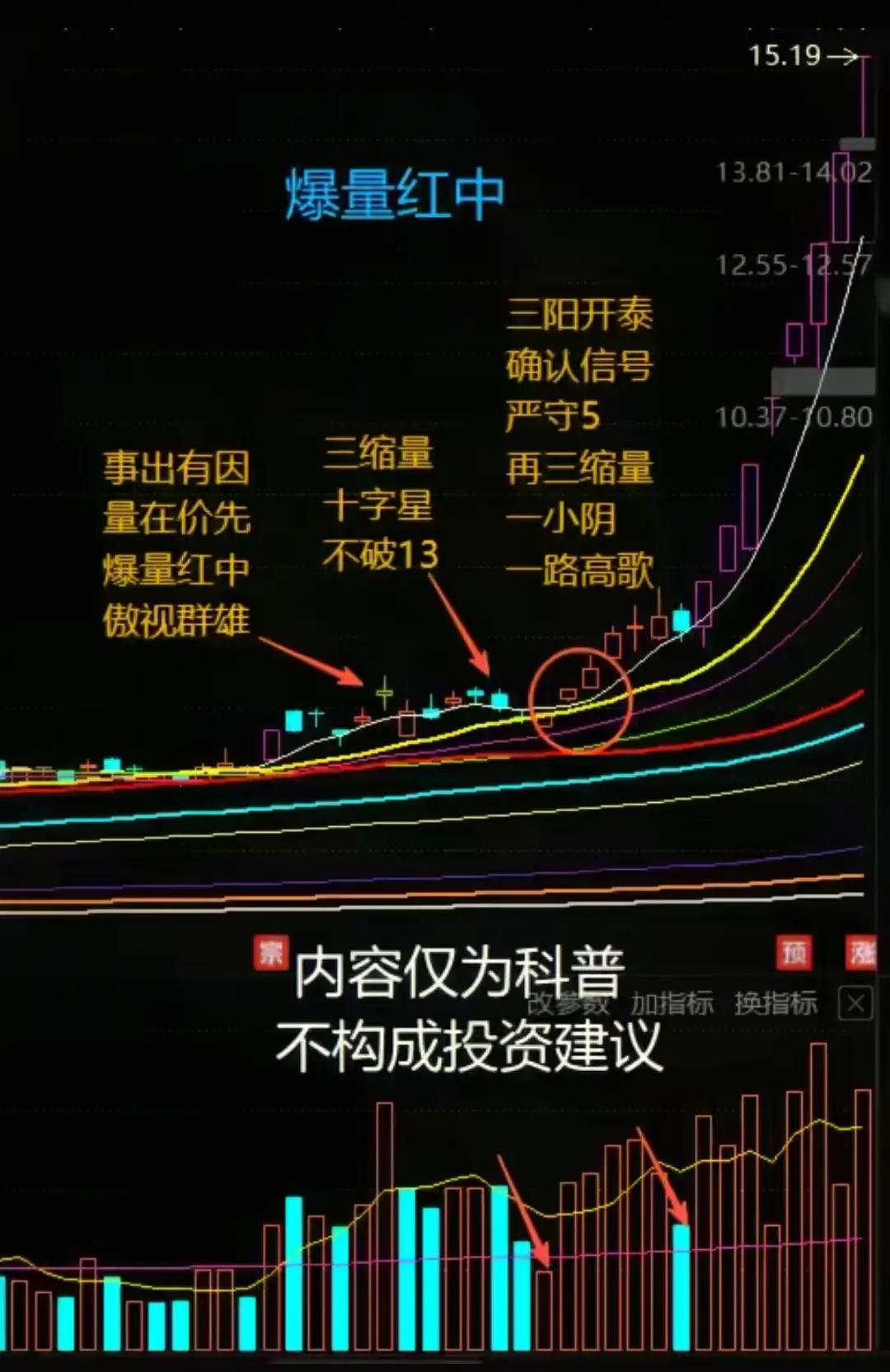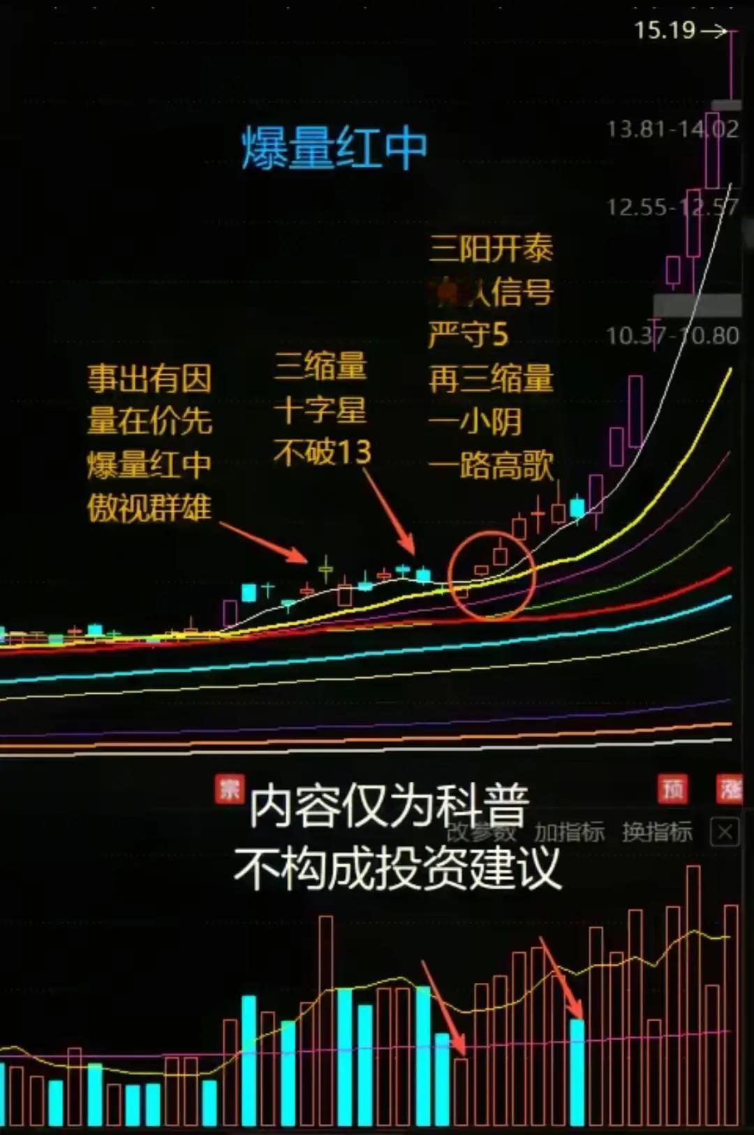 爆量红中战法核心要点 核心逻辑:量在价先,通过量价关系识别主力意图,捕捉主升浪起爆点。 三大关键信号: 1. 爆量红中(起爆点):底部/平台出现巨量阳线,突破关键阻力位,标志主力吸筹完毕,即将拉升。 2. 三缩量洗盘(蓄势期):突破后洗盘,特征为:①缩量十字星;②股价不破13日线;③末期现缩量小阴线,预示洗盘结束。 3. 三阳开泰(确认点):洗盘后连收三阳,确认主升浪。此时严守5日线:不破则持,跌破则走。 操作纪律:见信号不急追,待洗盘结束、三阳确认后上车,结合量价均线综合判断,知行合一。