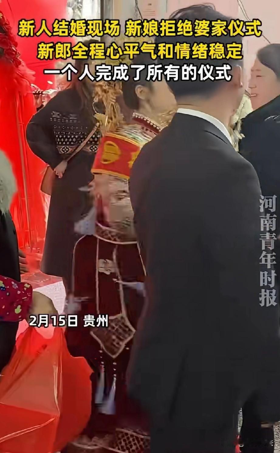 “太不给面子!”贵州,新郎、新娘结婚当天,新娘冷着脸抗拒配合婆家的仪式,长辈拉着劝和也不肯,新郎一句话没说,全程一个人完成了所有的仪式,没看出一丝不悦,网友:以后的日子也不好过。 结婚当日,新郎、新娘原本应该喜气洋洋,可当举行仪式时,却出现了令人意想不到的状况——新娘突然冷下脸,态度坚决地表示绝不参加婆家的仪式。 她还一个劲儿地往后退,那架势,仿佛恨不得立刻逃离这个房间。 婚礼现场,原本热闹非凡,敲锣打鼓的声音交织在一起,亲朋好友们满心欢喜地围在新郎、新娘身边,满心期待着见证他们完成重要的婚礼仪式。 然而,就在仪式即将开始的节骨眼上,新娘却满脸抗拒,脚步不由自主地往后退。 新郎呢,就静静地站在一旁,默默地看着新娘,既不出声劝说,也不上前拉她,仿佛眼前发生的一切都与他毫无关系。 这时,一位看起来像是家中长辈的女子,赶忙走上前去,一把拉住正在后退的新娘的胳膊,用力往仪式场地里拽,嘴里还说着劝慰的话,试图让新娘参加婆家的仪式。 新娘奋力往后挣脱,使劲儿甩开了长辈抓住她的手。 可这位长辈并未就此罢休,依旧紧紧抓着新娘不放,脸上还勉强挤出一丝尴尬的笑容。 新娘见长辈如此执着,心中怒火更盛,一使劲儿再次将她甩开。 此刻,新娘脸上的怒容愈发浓重,她感觉仿佛全世界都在与自己为敌,在这一瞬间,她是那么的无助。 毕竟,新郎自始至终都站在一旁,一言不发,也不替新娘说话。 新郎的行为让人实在猜不透他心里究竟在想些什么。也许他是对新娘的行为心怀不满,也许他只是不想在这隆重的场合把事情闹得太僵。 随后,新郎在一位男长辈的指引下,独自一人缓缓跪拜,按照流程一步步完成仪式。 他的脸上平静如水,根本看不出有任何愤怒的情绪,仿佛刚才发生的一切都未曾发生过。 新郎全程心平气和,没有流露出一丝不高兴,最后,他抱着红色的被子,稳步前往下一个流程。 而新娘依旧冷着一张脸,站在一边看着新郎完成所有仪式。 最后,还是那位女子拉着新娘的胳膊,跟在新郎身后,一同前往下一个流程。 现场的亲朋好友们也都一脸茫然,纷纷跟在后面,小声地窃窃私语,都在猜测新娘为啥不愿意参加婆家的仪式呢? 有人说,新娘太不懂事了,任性也得分场合,这么做把婆家和老公的面子都丢了,以后在村里也会被人议论,入乡随俗,这么简单的道理都不懂吗?以后的日子也不会好过的。 也有人说,不明情况不便评说,但这么大的仪式,事前应该有沟通,通过沟通尽量回避让任何一方感到不适的环节,不要拿“入乡随俗”说事,有时一个地方的风俗恰恰是另一个地方大忌,要相互理解和包容。 还有人说,既然新郎心平气和,说明双方是事先沟通过的,他知道并同意新娘不参与这种仪式,是那位硬要拉新娘的长辈多事了。 说白了,大喜的日子里,婚礼上新娘抗拒参加婆家仪式,闹的是挺不愉快的。 但是,新娘突然抗拒,肯定是有原因的,也许是之前婆家有让她不满的地方,也许是仪式环节让她不舒服。 新郎不劝也不出声,可能是想息事宁人,可这反而让新娘更无助。 要知道,婚姻里,沟通太重要了。遇到问题,两人得坐下来好好说说,把心里的想法倒出来。 新郎要是能及时问新娘咋回事,新娘也能说说自己的委屈,说不定就不会闹成这样。 而且婆家长辈也不该强行拉新娘,这会让新娘更抵触。婚礼是婚姻的开始,这么一闹,两人心里都有疙瘩了。以后过日子,得学会换位思考,多理解对方,不然这日子可不好过。 《民法典》婚姻家庭编,夫妻有相互扶养的义务,在婚姻缔结过程中也应相互尊重、理解。 婚礼上新娘抗拒仪式,新郎不沟通独自完成,反映出双方在重要时刻缺乏有效交流。 婚姻是两个人的事,婚礼作为重要仪式,双方本应共同面对问题,可他们却各自为战,这违背了婚姻中相互扶持、尊重的原则,为婚后生活埋下隐患,需重视沟通以维护婚姻关系。 你觉得新娘因为什么原因抗拒婆家仪式呢?