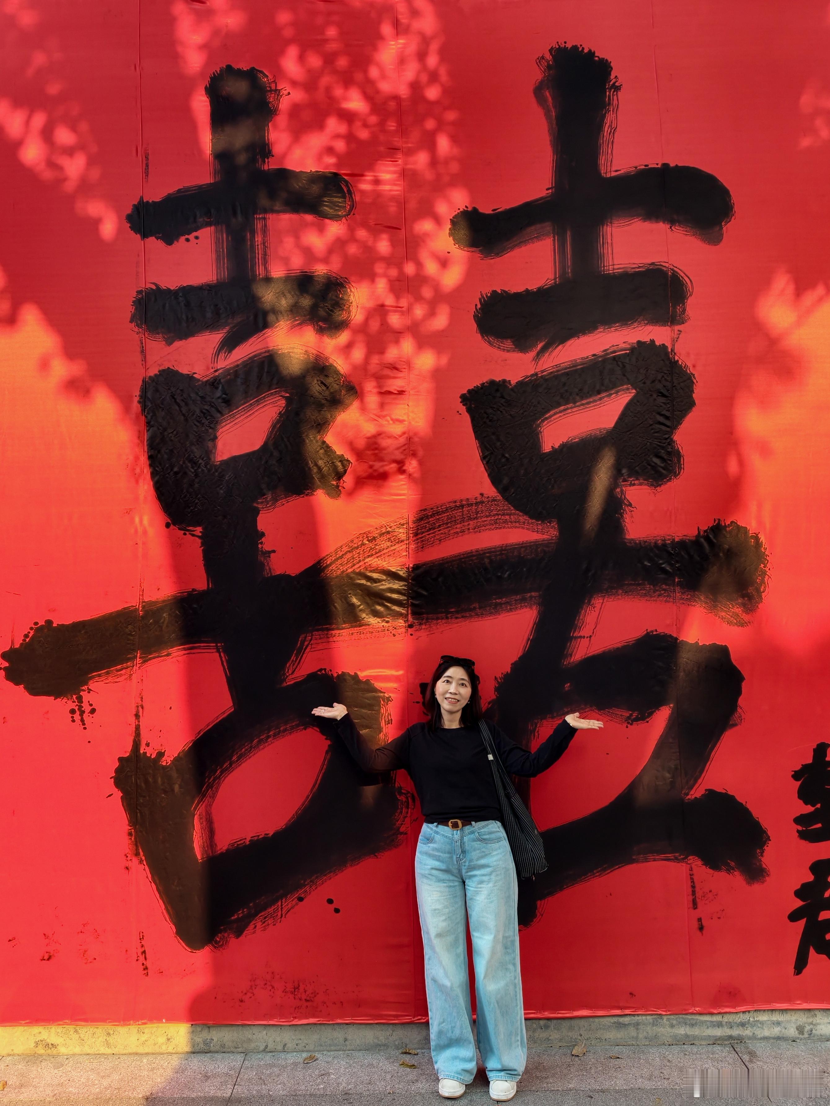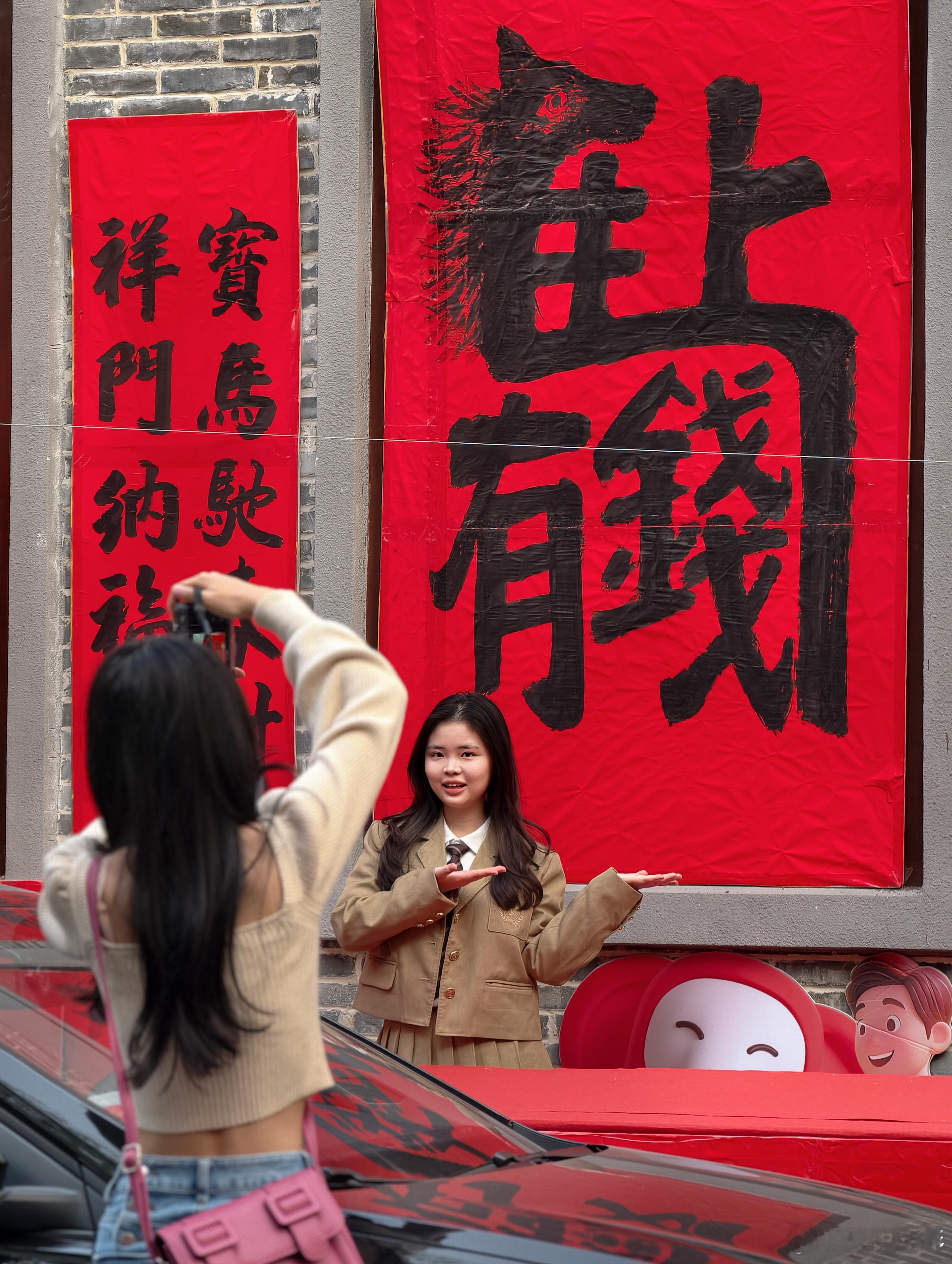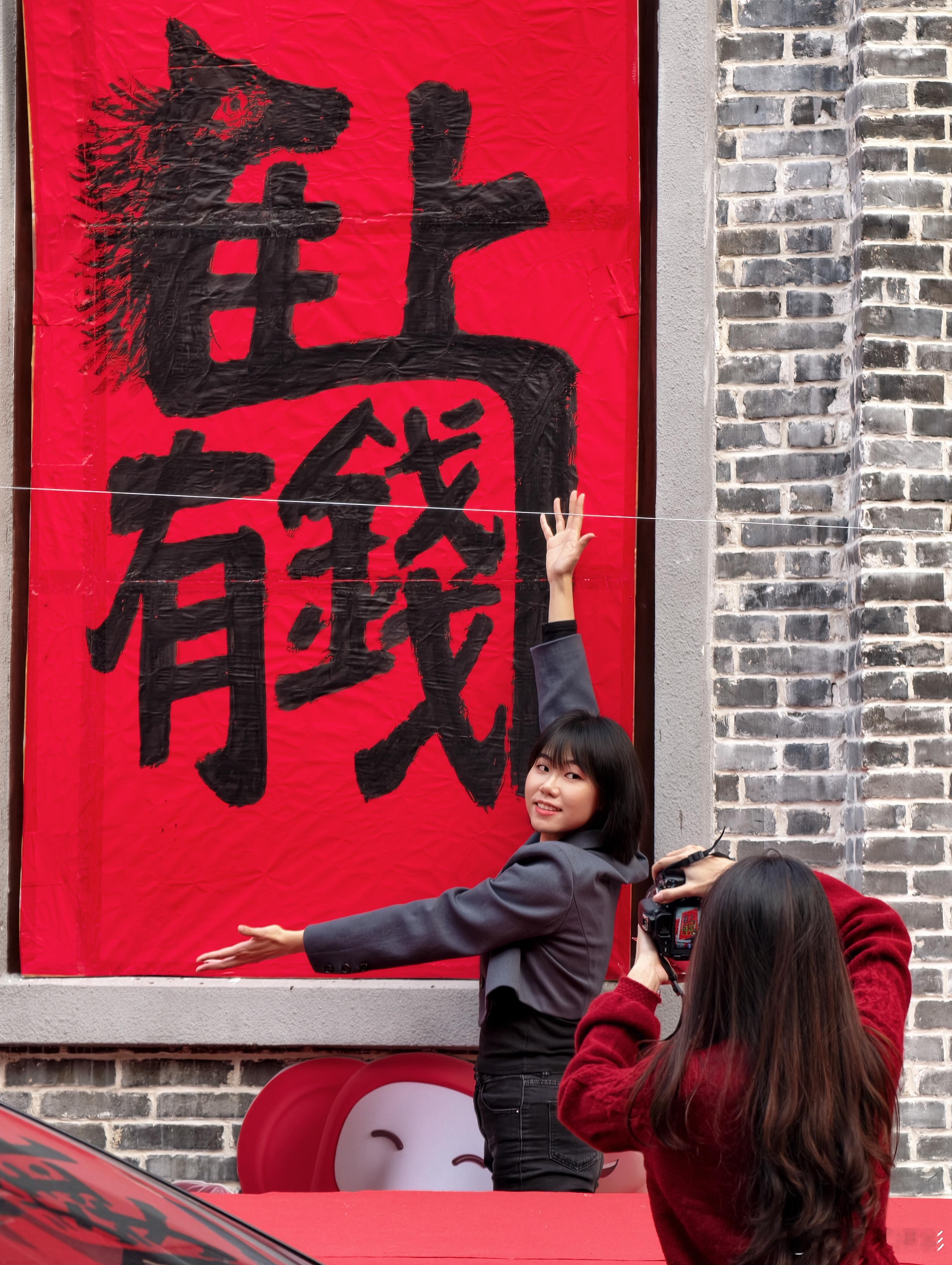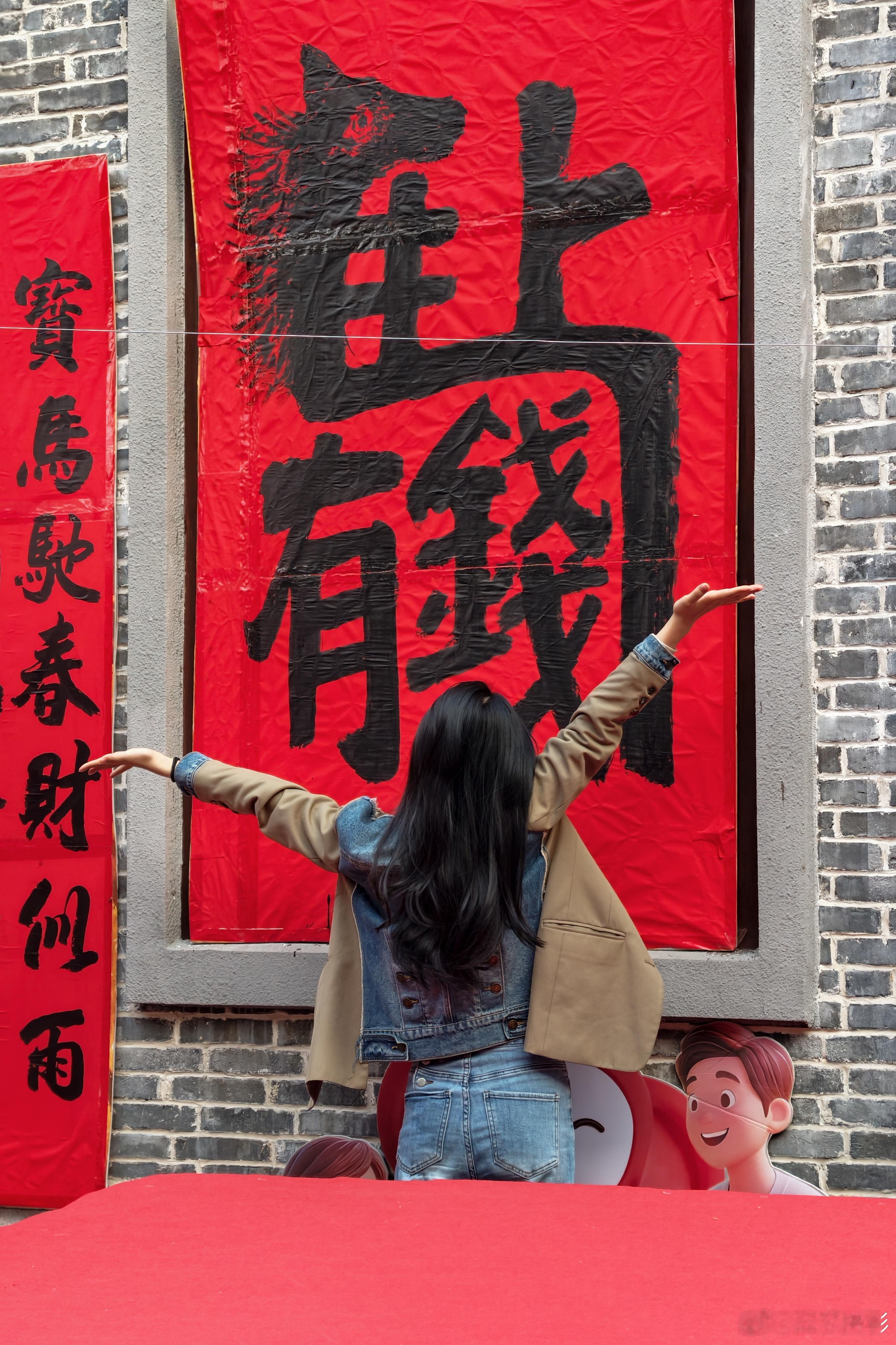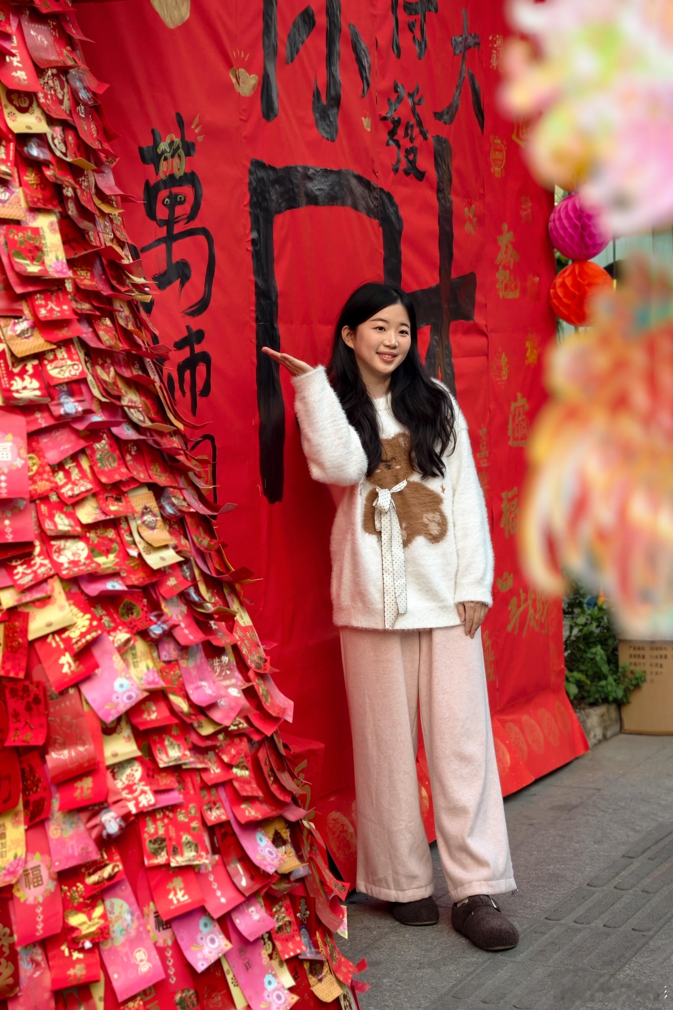 红墙金句+红包树+巨型“囍”、“马上有钱”书法,随手一拍都是年味大片,小姐姐也少不了