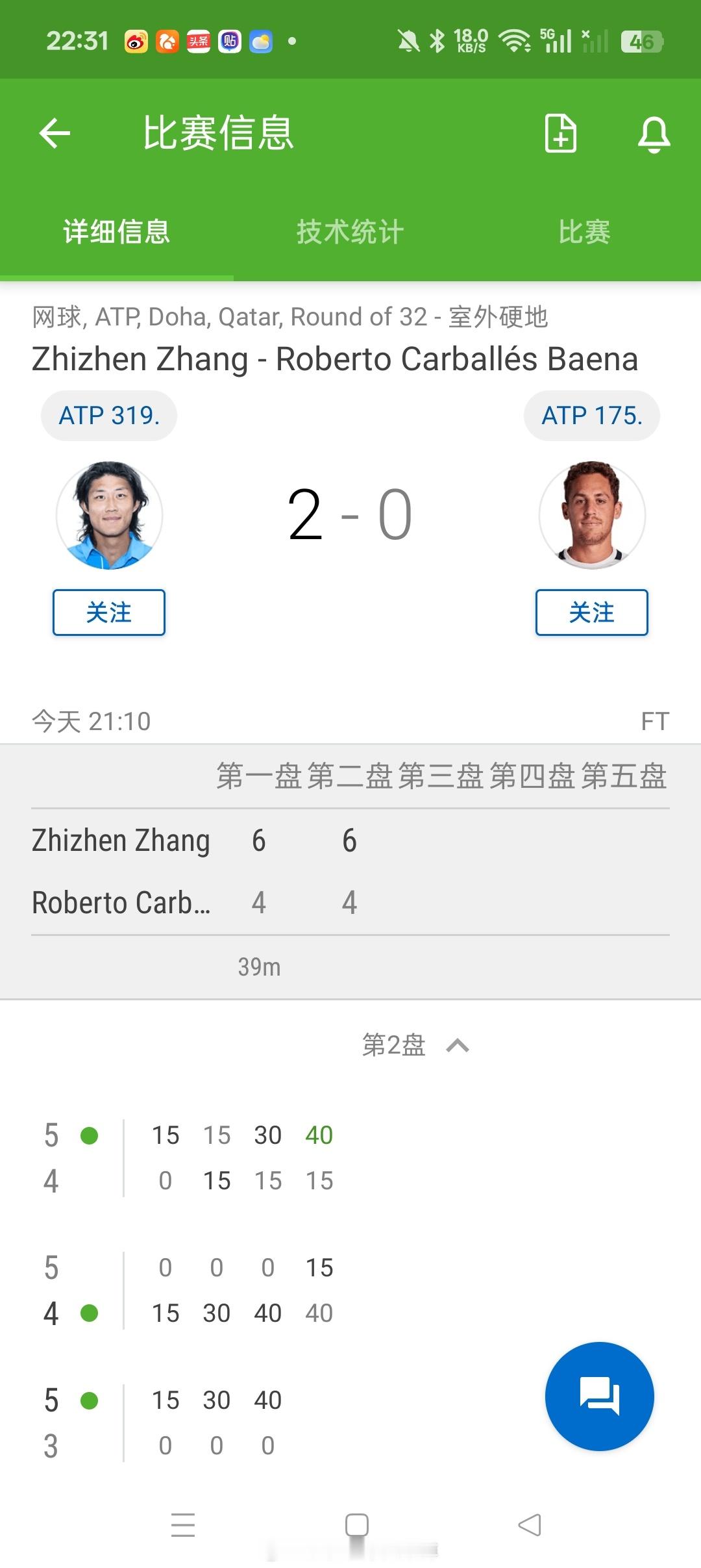 【多哈ATP500】男单正赛第一轮张之臻🇨🇳 6-46-4 资格赛突围的🇪🇸球员巴埃纳晋级第二轮张之臻收获50分即时排名261位