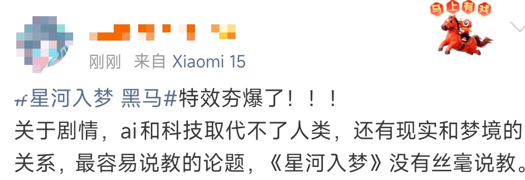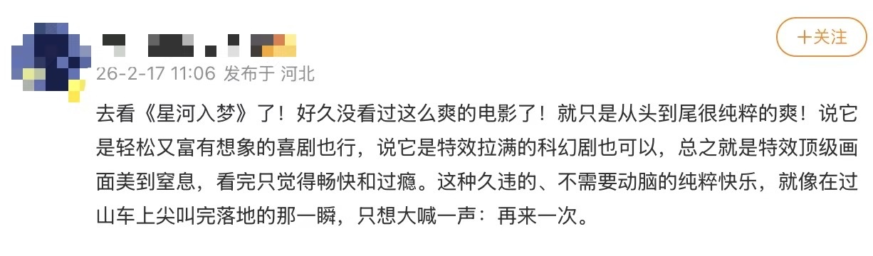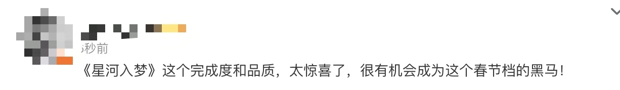 看星河入梦偶遇郭帆看了一圈星河入梦的评价,感觉还不错,特效好,超出预期的好看,又爽又燃又感动,4dx特效厅会更爽。郭帆导演也去支持了,还说真的不错,好喜欢这种而百花齐放百家争鸣的感觉。有诚意的科幻电影真的很刺激,看好星河入梦能成为黑马。