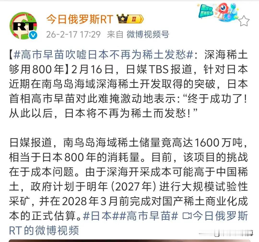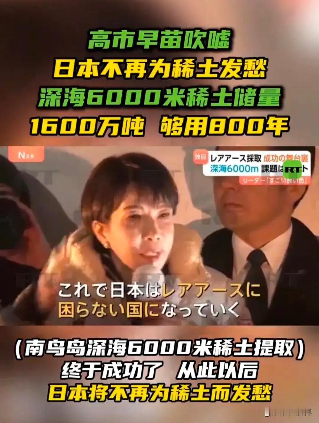 高市早苗又发癫了。不提采矿难度、分离和提纯技术、能否规模化和产业化、对环境的污染程度,也不提具体成本,张嘴就说日本海底稀土储量丰富,以后再也不愁了。这话听着挺唬人,可仔细一琢磨,全是避重就轻的套路。她光嚷嚷“海底有矿”,怎么不提深海采矿的技术门槛有多高?那可不是海边捡贝壳,几千米的海底高压、低温、腐蚀环境,现有的设备下去一趟都费劲,更别说大规模开采了。分离提纯技术呢?稀土这玩意儿十七种元素混在一起,提纯难度堪比绣花,日本自己在这块的技术积累根本不够看。成本账更是只字不提——从勘探、开采、运输到提炼,哪一步不是烧钱的无底洞?还有环境污染,深海生态极其脆弱,采矿搅起的沉积物和重金属污染,对海洋系统就是一场灾难。这些实质问题她一概回避,纯粹是画个大饼安抚国内情绪。既然她说得这么轻巧,那咱们不妨顺水推舟:从今往后,一克稀土也别指望从中国买了。让她自己下海慢慢捞吧,看看是她的嘴硬,还是海底的石头硬。