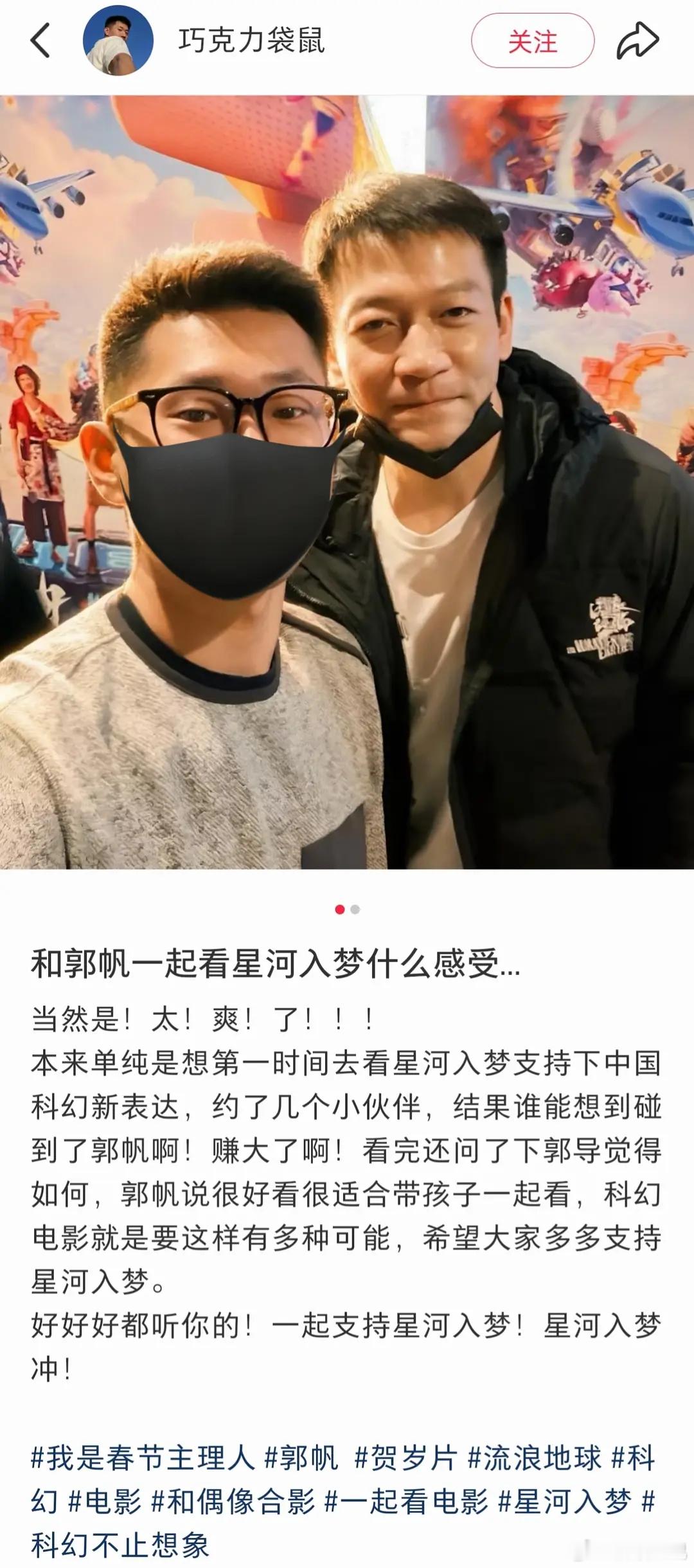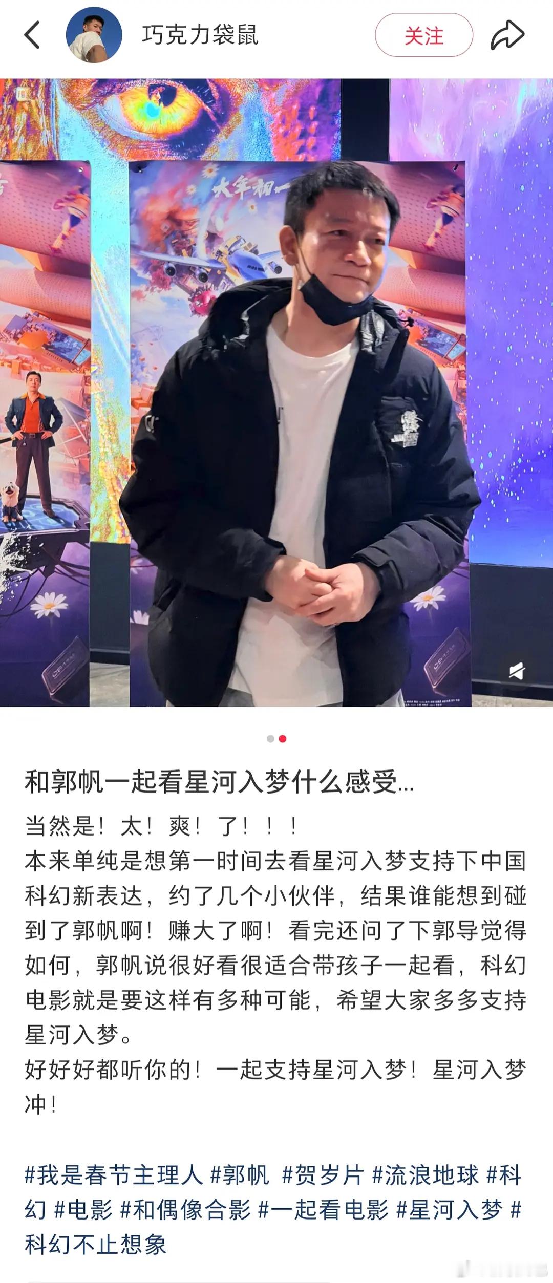 看星河入梦偶遇郭帆流浪地球的导演郭帆去看星河入梦了,还说电影好看,适合带孩子一起看。一群真正为中国科幻电影努力的人值得尊重!!