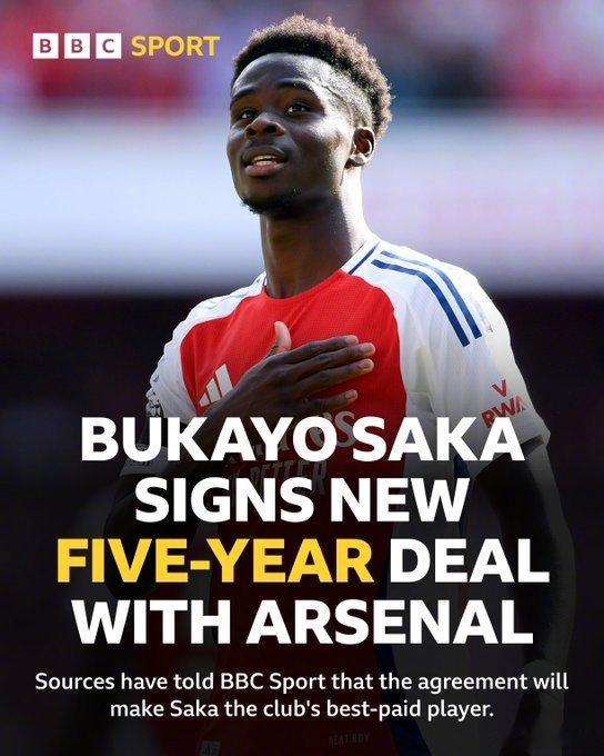 【核心球员敲定新合同】BBC:经过一年的续约谈判,24岁的萨卡将与阿森纳签下一份新的5年合同,周薪将超过30万英镑,成为队史周薪最高的球员。英超