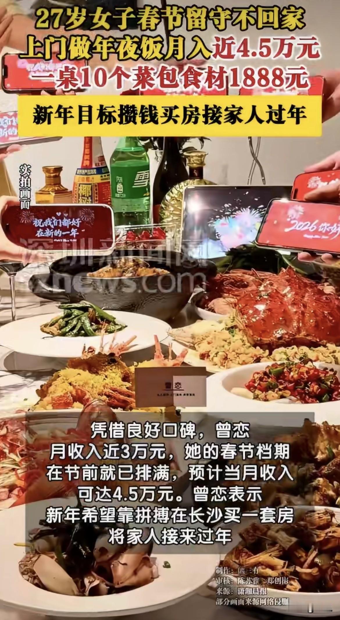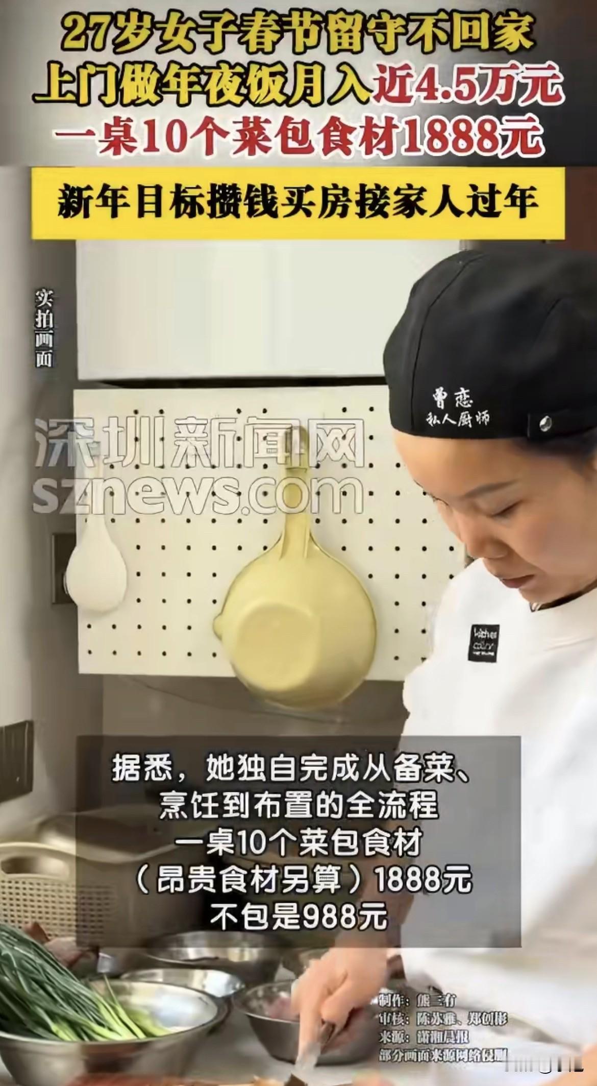 绝了,一个月挣四万五,还是过年这一个月。 长沙一个95后姑娘,今年没回邵东老家,留在城里专门给人做年夜饭。 一桌十个菜,包食材1888,不包食材988。从除夕前半个月就开始接单,一直排到正月十五。 她叫曾恋,做私厨这行快三年了。平时一个月挣三万左右,过年这一个月,直接冲到四万五。 年二十八那天,她在朋友圈发了一条:今年春节留在长沙接单,档期开放。 除夕的档期,秒没。 家里人知道她不回来过年的时候,她的行程已经排满了,想回也回不去。 曾恋说,其实早两年就想接年夜饭的单子,今年总算实现了。年轻嘛,能赚就多赚点,她也享受这种爆单的乐趣。 但私厨这活儿,没外人想的那么简单。 她没有团队,就自己一个人。从备菜到成品到摆盘,全包圆。每次上门前,得跟客户反复沟通,喜欢什么口味,有什么忌口,摆盘要什么风格,事无巨细。 除夕那天,她早上八点就出门了。 第一家的开餐时间是下午一点。她提前买了汉堡,想着中午有空在车上垫一口。结果出门太急,汉堡落家里了。 中午从第一家出来,饿得不行,在车上翻出几个水果,凑合吃了,又赶去下一家。 天黑了,她在别人家的厨房里忙活,灶火呼呼的,锅里咕嘟咕嘟冒着热气。客厅里传来一家人的说笑声,小孩在跑,老人在笑,电视里放着春晚。 她站在厨台前,听着那些声音,忽然特别想家。 家里人打电话问,吃年夜饭了没? 她说吃了,客户非要留她一起吃。 其实这是她的工作准则——不在客户家吃饭。再热情的邀请,她都婉拒。 那天晚上,所有单子忙完,她回到车上,给自己点了一份外卖。 湘西泡菜。 没有太多选择了,店里就剩这个。她一边吃着泡菜,一边用手机回复第二天的订单消息。 记者问她累不累。 她说身体累不怕,有精神压力的时候会让自己歇一歇。 新的一年,她有个目标:在长沙买套房,把家里人接过来一起过年。 这样明年除夕,她就能在家里吃年夜饭了。 有人算过一笔账,按她这个收入,买房不是梦。 但也有人较真,说她一个月四万五,是毛收入还是净收入?食材成本、交通成本、时间成本,刨去这些还剩多少? 还有人关心,上门做饭,食品安全怎么保证?万一吃坏了算谁的? 这些问题,曾恋没细说。 但有一个细节挺有意思。 她服务过那么多客户,从来不在人家家里吃饭。哪怕客户再三邀请,哪怕忙了一整天饿得前胸贴后背,她也坚持自己解决。 这不是矫情,是职业边界。 你进了人家的门,做了人家的饭,你是那个提供服务的人。坐到那张饭桌上,性质就变了。 这个边界,她守得很清楚。 其实像曾恋这样的私厨,现在越来越多了。 有人嫌去饭店麻烦,有人就想在家吃口热乎的,有人觉得家里氛围好、私密性强。请个厨师上门,省了自己洗菜切菜炒菜刷碗的功夫,还能吃上大厨水准的菜,何乐而不为。 尤其过年这阵子,很多家庭选择这种方式。 不用老人忙前忙后,不用儿媳妇累得腰疼,一家人围坐着,等着开饭就行。 曾恋今年没等上自家的年夜饭,但她让几十个家庭,吃上了舒心的团圆饭。 这事你怎么看? 如果条件允许,你会请厨师上门做年夜饭吗?