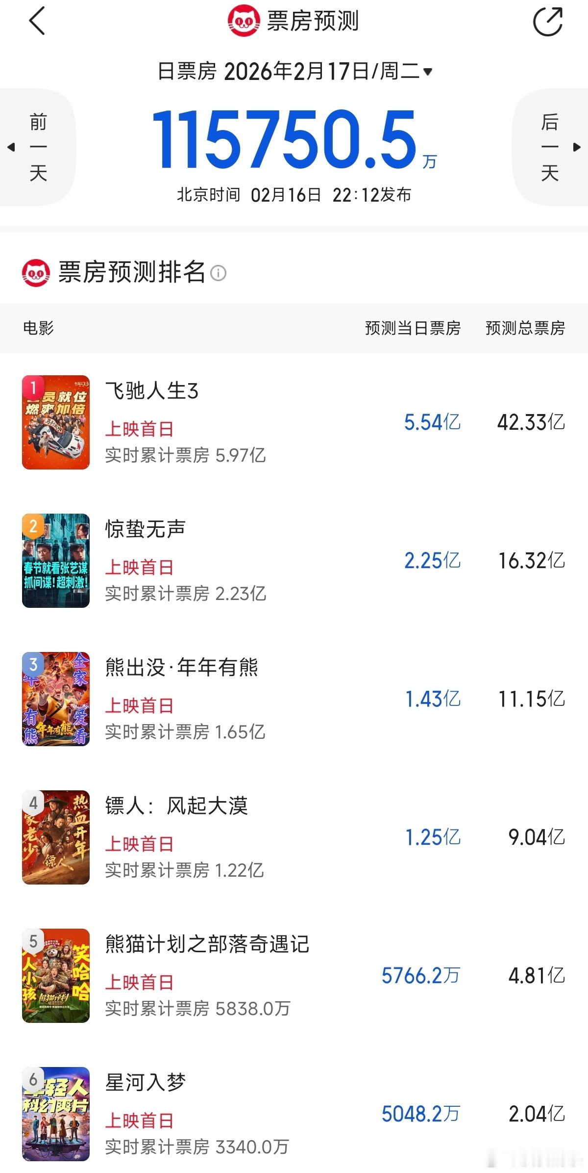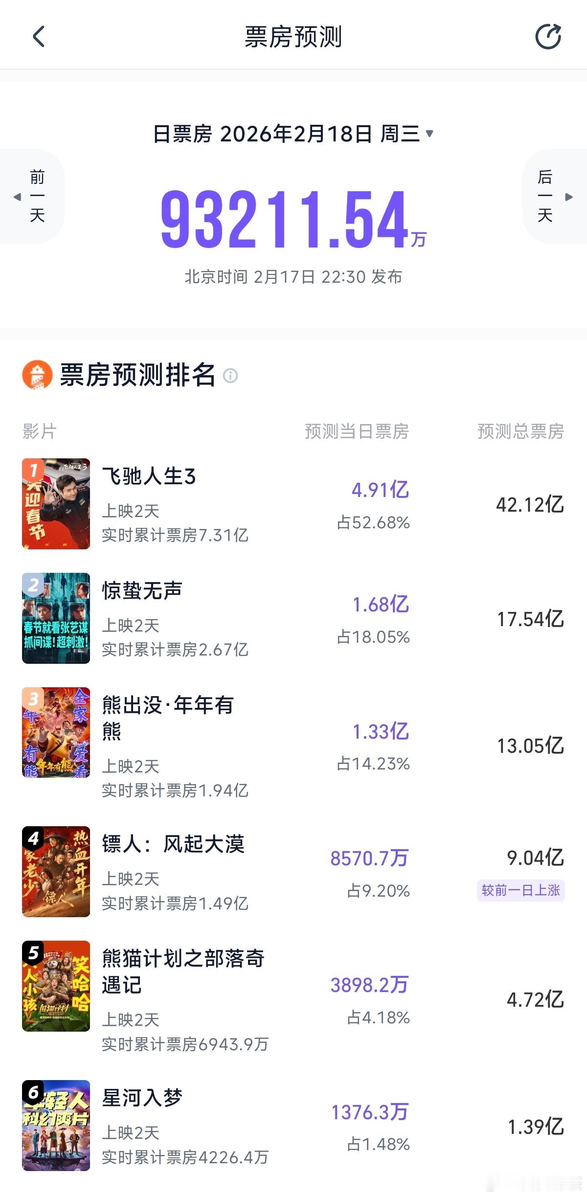 春节档票房预测 灯塔 猫眼《飞驰人生3》 43.67👉🏻 42.12 42.33👉🏻50.43《惊蛰无声》 21.42👉🏻 17.54 16.32👉🏻15.98《熊出没》 13.65👉🏻13.05 11.15👉🏻12.01《镖人》 8.41👉🏻9.04 9.04👉🏻 9.00《熊猫计划》 5.22👉🏻4.72 4.81👉🏻 5.05《星河入梦》 3.00👉🏻1.39 2.04👉🏻1.25