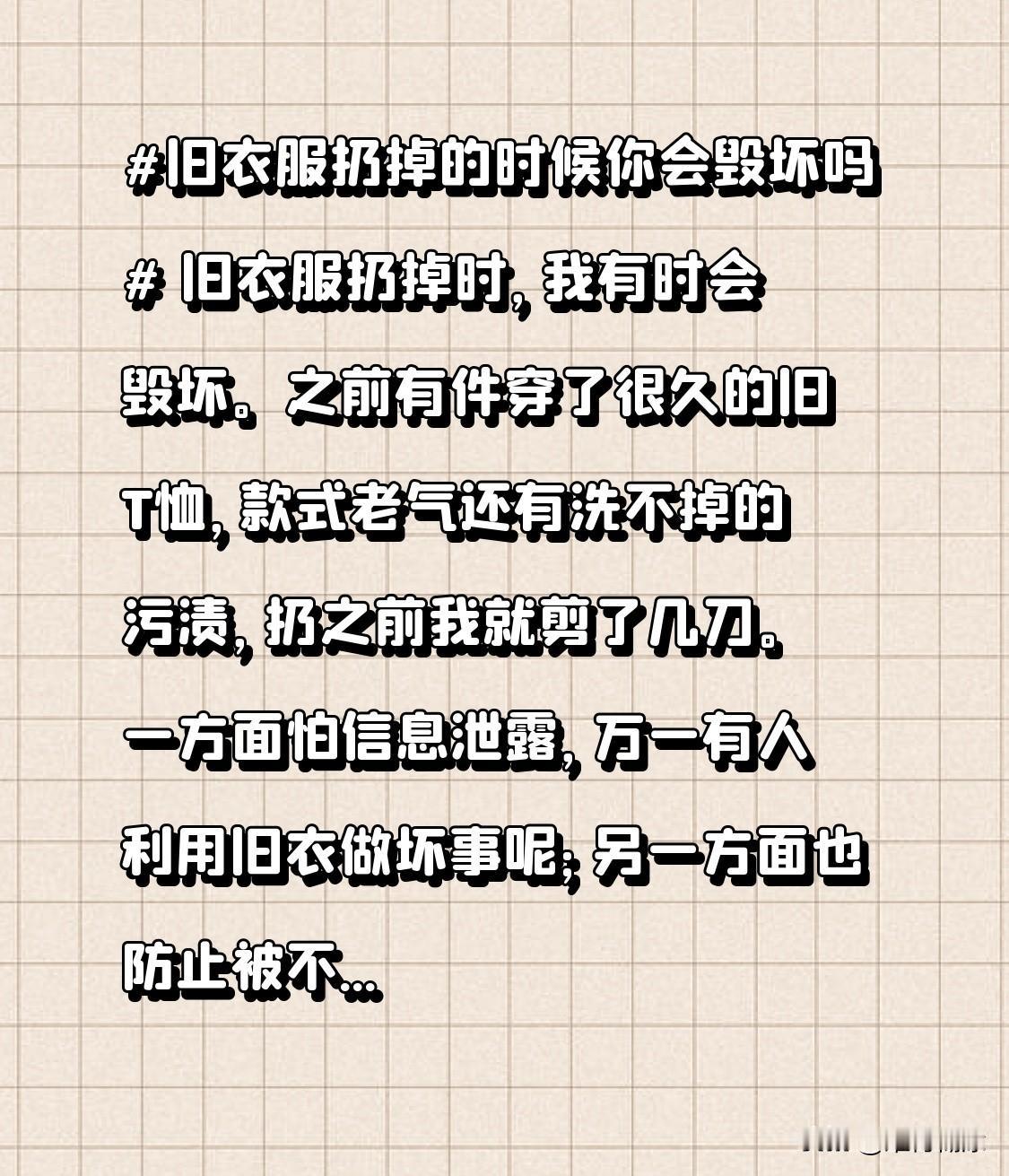 旧衣服扔掉时,我有时会毁坏。之前有件穿了很久的旧T恤,款式老气还有洗不掉的污渍,扔之前我就剪了几刀。一方面怕信息泄露,万一有人利用旧衣做坏事呢;另一方面也防止被不良商家回收翻新。其实旧衣还有很多处理法,能改造就改造,能捐赠就捐赠,别浪费啦。