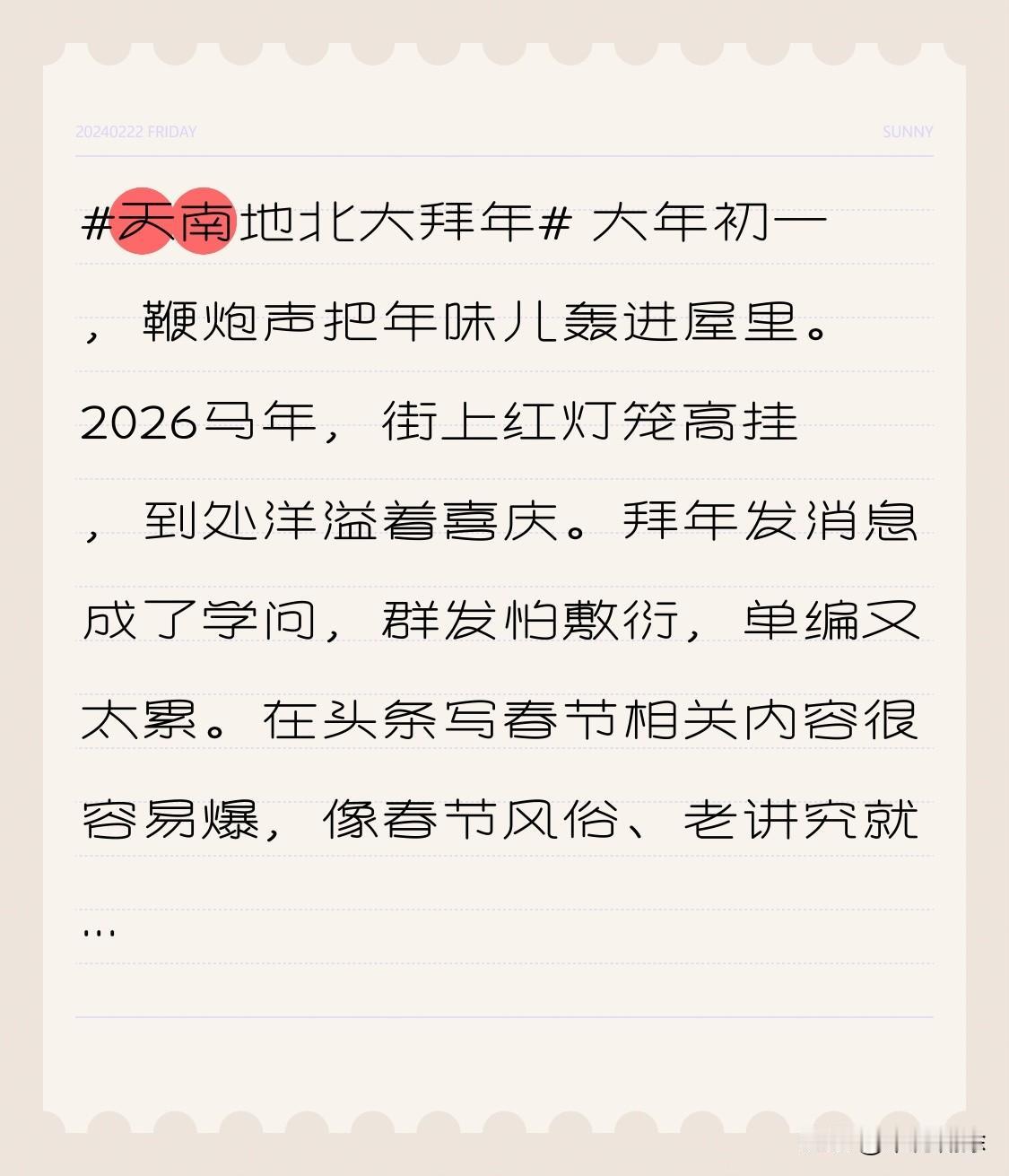 大年初一,鞭炮声把年味儿轰进屋里。2026马年,街上红灯笼高挂,到处洋溢着喜庆。拜年发消息成了学问,群发怕敷衍,单编又太累。 在头条写春节相关内容很容易爆,像春节风俗、老讲究就很受欢迎,我朋友一篇春节风俗文收益达2000多元。抓住这些题材,咱也能借流量赚一笔!