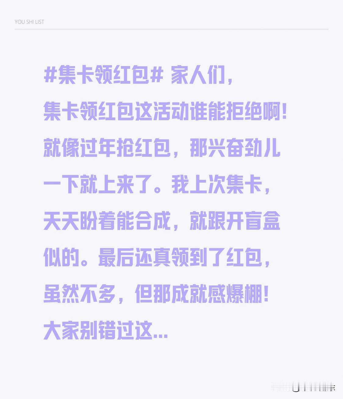家人们,集卡领红包这活动谁能拒绝啊!就像过年抢红包,那兴奋劲儿一下就上来了。我上次集卡,天天盼着能合成,就跟开盲盒似的。最后还真领到了红包,虽然不多,但那成就感爆棚!大家别错过这乐子,一起集卡,说不定下一个幸运儿就是你,赶紧冲!