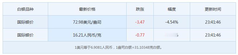 今日国际贵金属价格大幅回落, 特别是国际白银价格 盘中跌破72美元。 现在报价72.98美元/盎司, 较上一日下跌-4.54%。 我们知道1美元等于6.9081人民币, 1盎司白银=31.10348克白银。 因此简单折算成人民币就是16.21人民币/克。 不过在购买银饰或者制品时, 价格会因为设计、工艺和品牌等因素有所不同。