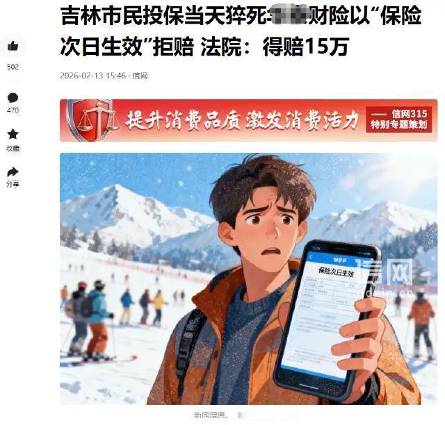 吉林,杨先生买了某财险的户外运动人身意外伤害保险,当天计划去滑雪,投保4小时后在雪场猝死。可某财险以保险次日生效为由拒赔,杨先生儿子小杨将其告上法庭。法院审理认为,保险公司收了保费生成电子保单,合同自承保起成立,最终判赔15万。 (来源:信网) 2025年2月,杨先生打算去滑雪好好放松一下,这大冷天的,滑雪可是个刺激又好玩的项目。 杨先生也是个行动派,一大早就在线上麻溜地买了华泰财险的户外运动人身意外伤害保险,还付了85块保费。您猜怎么着,才过了一分钟,电子保单就生成了,这速度,杠杠的。 本来想着买了保险,滑雪能更安心点,可谁能料到,意外就这么突然降临了。才过了4个小时,杨先生在雪场排队等着进场,突然就晕倒在地,呼吸都没了。 雪友们一看,这可不得了,赶紧帮忙叫救护车,医院那边也是全力抢救。可遗憾的是,最终还是没能把杨先生从死神手里抢回来,医院诊断是猝死。 这突如其来的变故,让杨先生的儿子小杨悲痛欲绝。可日子还得继续过,小杨想着父亲买了保险,就去找某财险理赔,希望能得到一些经济上的补偿。 可这保险公司,直接就给拒赔了,理由是保险次日才生效。小杨觉得这规定太不合理了,父亲都付了保费,保单也生成了,咋就不算生效呢?这不是坑人吗? 小杨没跟保险公司多纠缠,直接就把这事告上了法庭。法庭上,双方那是各执一词。保险公司咬着保险次日生效的规定不放,说这是合同里的条款,得按这个来。 小杨这边也是据理力争,他说父亲买了保险,保费都交了,电子保单也生成了,这就说明合同已经成立了,保险公司就得承担保险责任。而且,父亲是在买了保险之后,在雪场发生的意外,这完全符合保险的理赔范围。 其实从法律上来说,这事还真不是保险公司说的那么回事。 根据《保险法》第十三条规定,投保人提出保险要求,经保险人同意承保,保险合同成立。保险人应当及时向投保人签发保险单或者其他保险凭证。保险单或者其他保险凭证应当载明当事人双方约定的合同内容。当事人也可以约定采用其他书面形式载明合同内容。依法成立的保险合同,自成立时生效。投保人和保险人可以对合同的效力约定附条件或者附期限。 杨先生付了保费,保险公司收了保费还生成了电子保单,这就说明保险人已经同意承保了,保险合同自承保起就已经成立了。 而且,双方并没有对合同的生效约定附条件或者附期限,所以合同应该自成立时就生效。保险公司说保险次日生效,这完全就是自己额外加的条件,没有法律依据啊。 再说了,杨先生买的是户外运动人身意外伤害保险,他买保险的目的就是为了在户外运动时能有个保障。 如果保险要次日才生效,那在这期间发生意外,投保人的权益谁来保障呢?这不是违背了投保人买保险的初衷吗? 法院审理时认为,保险公司收了保费生成电子保单,合同就已经成立了,而且没有附生效条件或期限,所以合同自成立时生效。 杨先生在保险期间内发生意外猝死,符合保险理赔的条件,保险公司应该承担赔偿责任。 最终,法院判决某财险赔偿小杨15万元。 说实话,保险公司这种以保险次日生效为由拒赔的规定,真的挺不合理的。它没有考虑到投保人的实际需求和权益,有点店大欺客的感觉。 保险公司以后在制定规定的时候,得多为投保人想想,不能光想着自己的利益。而且,在销售保险的时候,也得把保险的生效时间、理赔范围这些重要信息,明明白白地告诉投保人,不能藏着掖着,不然很容易引起纠纷。 大家在生活中有没有遇到过这种保险理赔纠纷的事呢?或者对保险生效时间有什么看法,都来评论区聊聊,咱们一起探讨探讨。