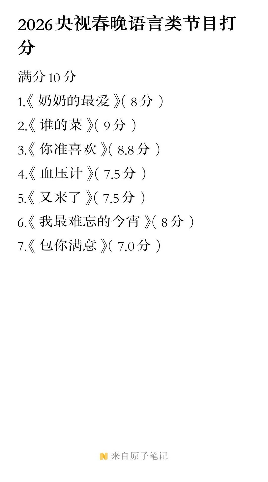 2026春晚歌曲前十and语言节目评分