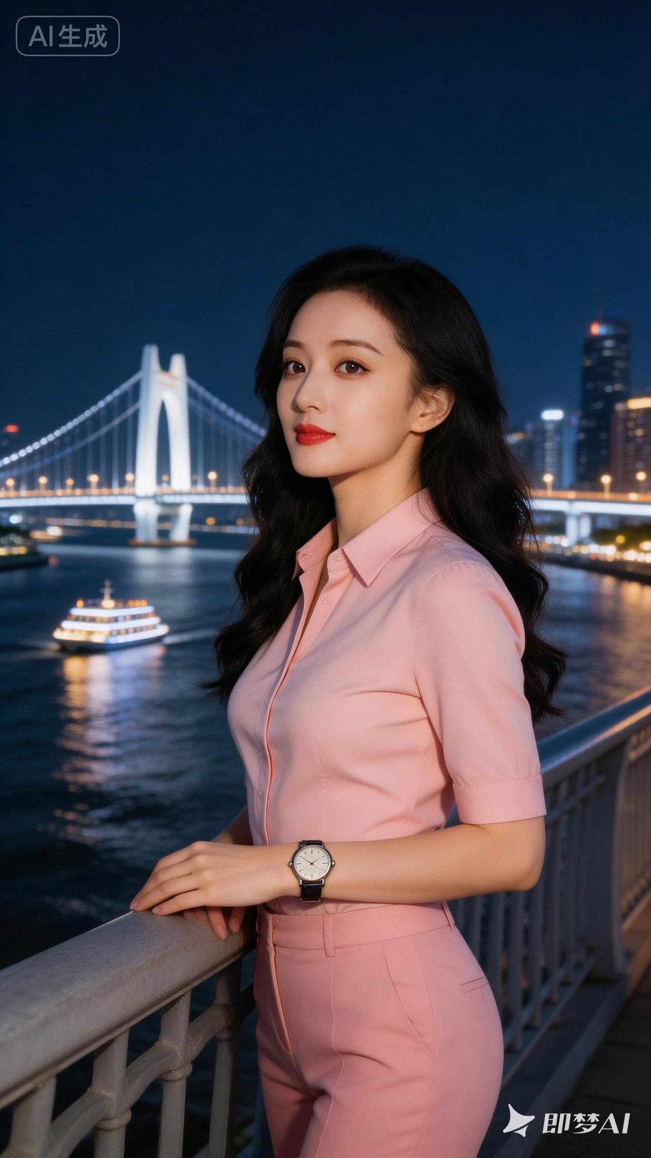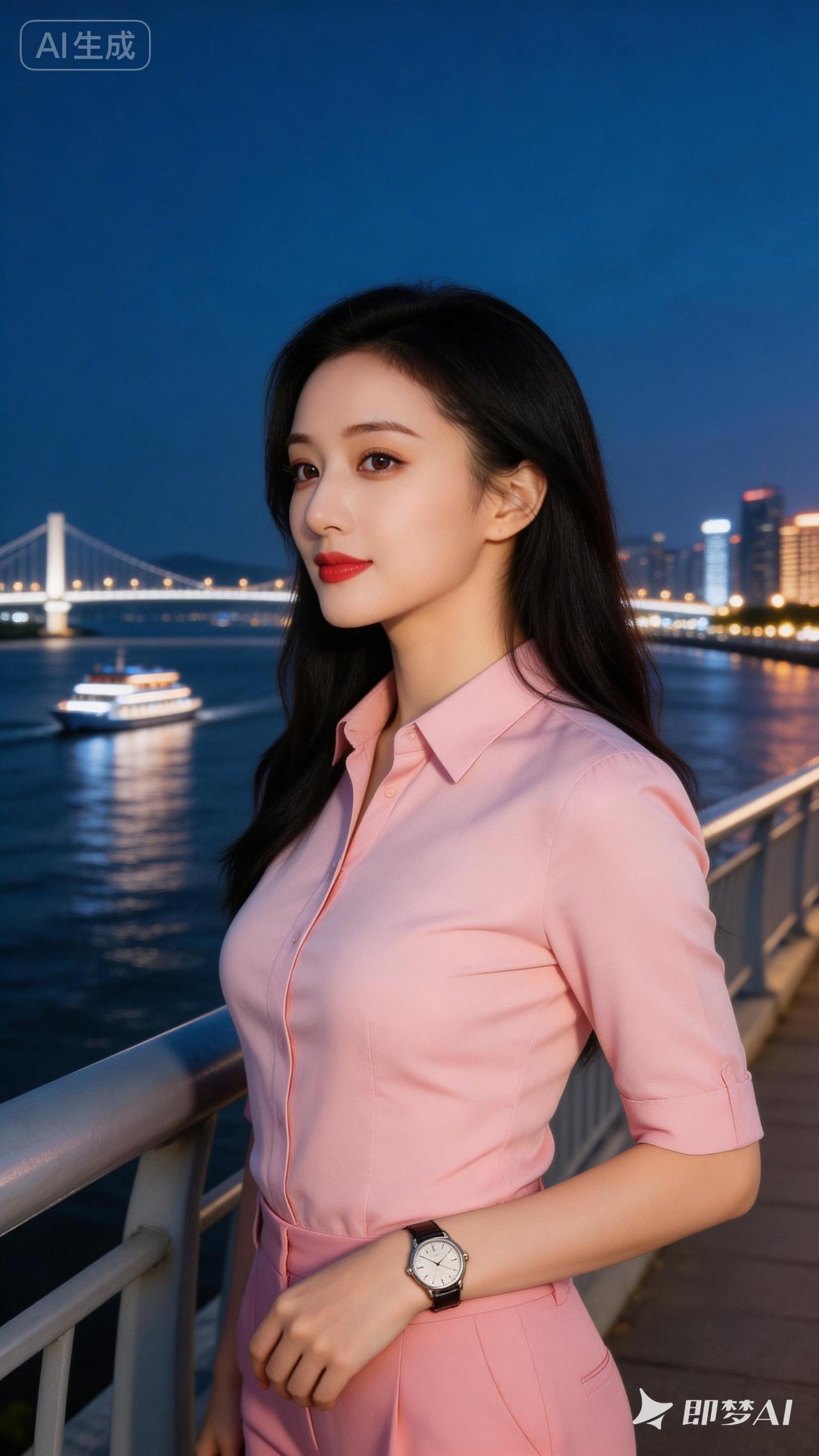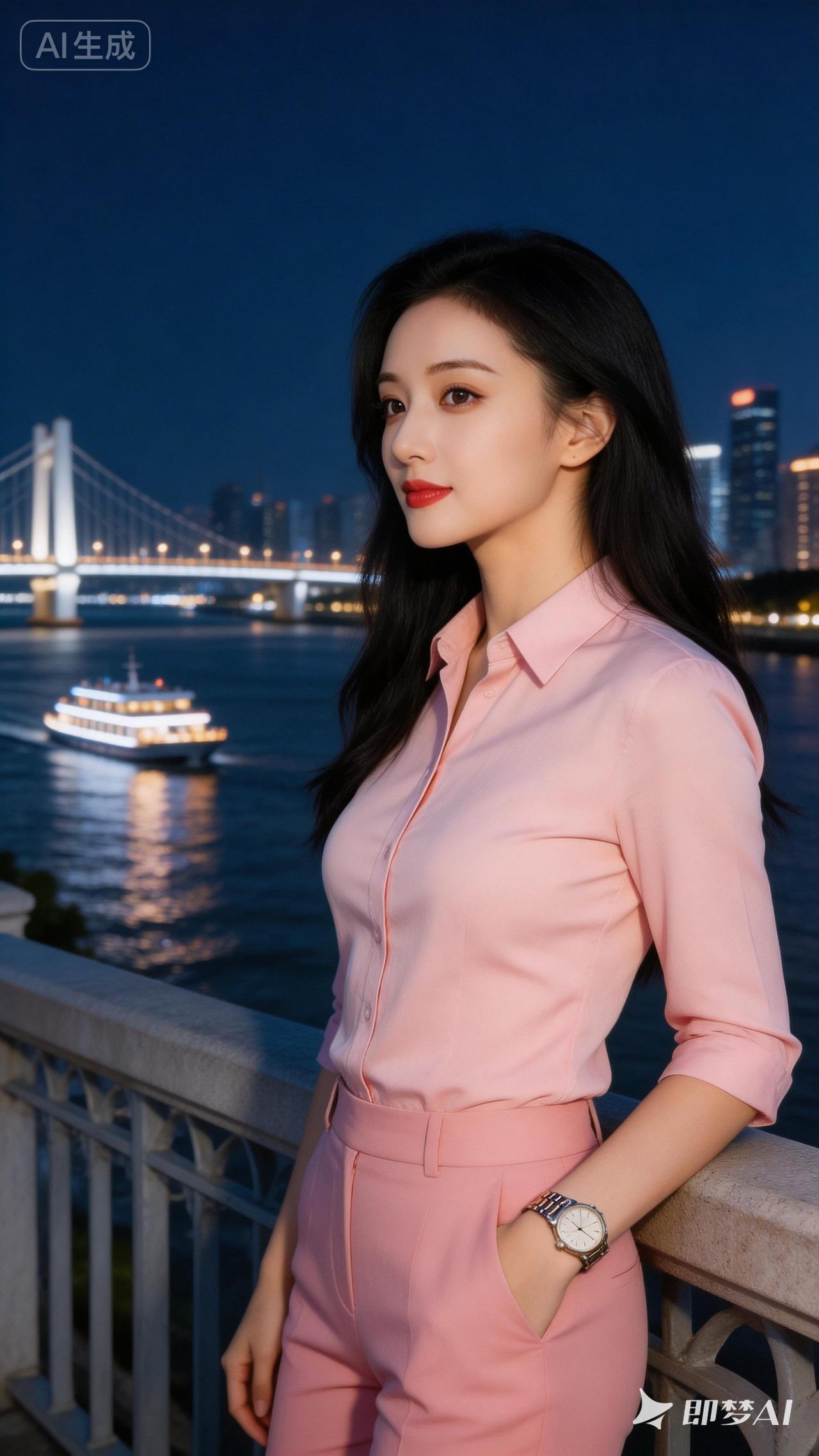 夜晚河畔,粉衣少女,静看灯火阑珊