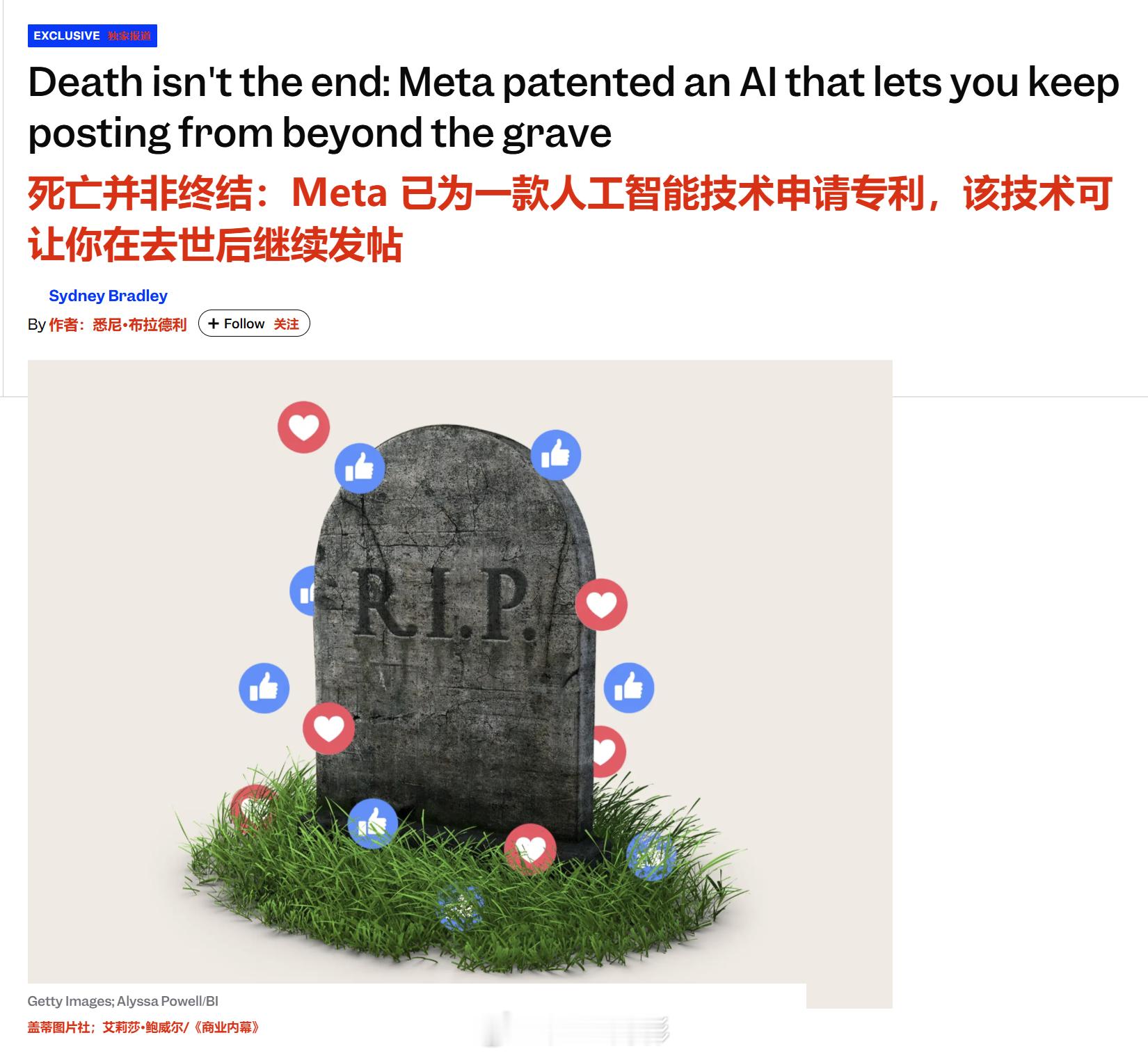 Meta 公司已为一种人工智能技术申请专利,该技术可通过分析逝者过往数据来模拟其行为,从而使其社交媒体账号保持活跃状态,继续发帖、发送消息及进行视频通话。