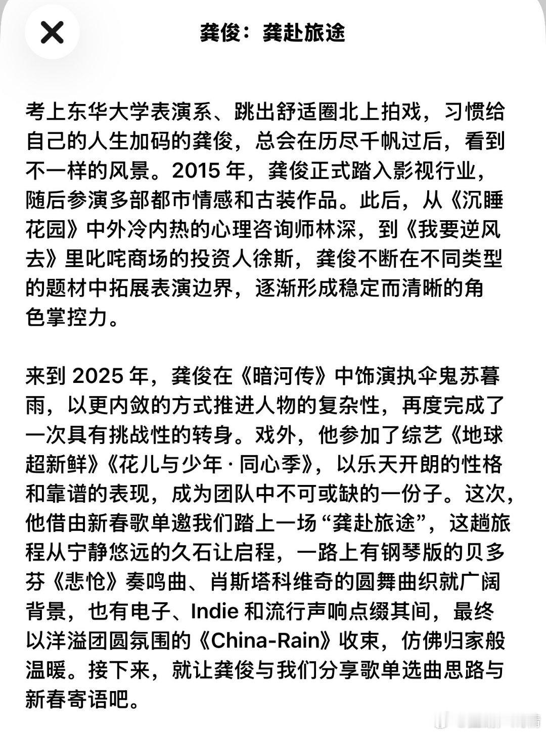 龚俊新年歌单《龚赴旅途》来了,之前受邀参加AppleMusic新年歌单的都是国际上知名的歌手,这次歌单也有各个领域的,而且龚俊还是近十年来出现的第一个大陆演员,也是今年歌单首发第一位,厉害了!