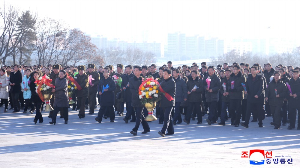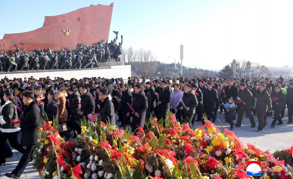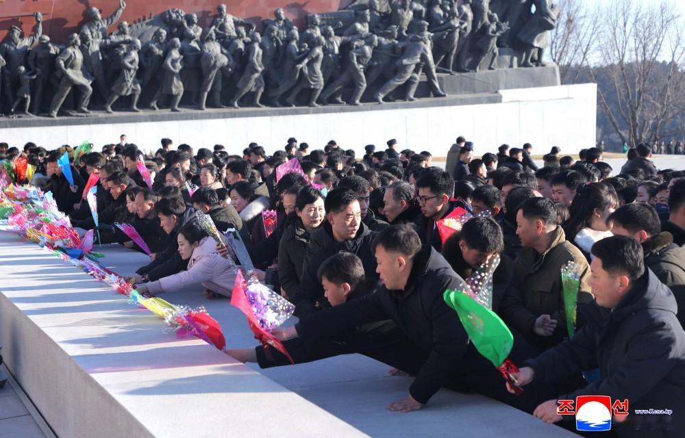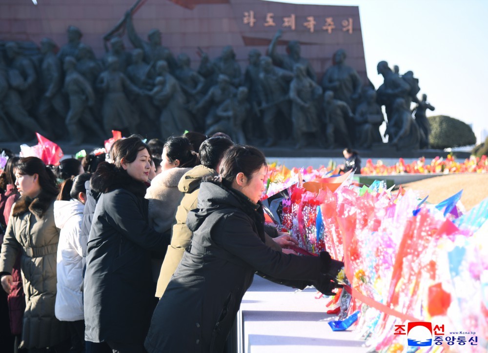 党政机关、武力机关、社会团体、省和中央一级机关、朝鲜人民军和社会安全军部队、工厂和大学等以本单位名义向矗立于万寿台岗上的金日成同志和金正日同志的铜像敬献了花篮。